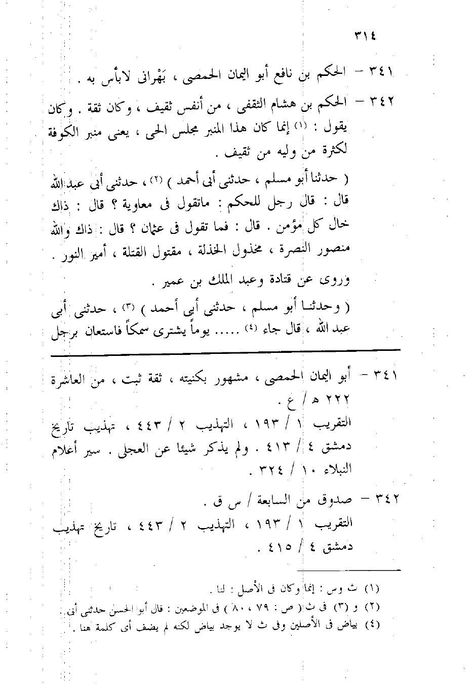 342 - الحكم بن هِشَام الثقفى من أنفس ثَقِيف وَكَانَ ثِقَة وَكَانَ يَقُول إِنَّمَا كَانَ هَذَا الْمِنْبَر مجْلِس الْحَيّ يعْنى مِنْبَر الْكُوفَة لِكَثْرَة من وليه من ثَقِيف حَدثنَا أَبُو مُسلم حَدثنِي أبي أَحْمد حَدثنِي أبي عبد الله قَالَ قَالَ رجل للْحكم مَا تَقول فِي مُعَاوِيَة قَالَ ذَاك خَال كل مُؤمن قَالَ فَمَا تَقول فِي عُثْمَان قَالَ ذَاك وَالله مَنْصُور النُّصْرَة مخذول الخذلة مقتول القتلة أَمِير النُّور وروى عَن قَتَادَة وَعبد الْملك بن عُمَيْر وَحدثنَا أَبُو مُسلم حَدثنِي أَبى أَحْمد حَدثنِي أَبى عبد الله قَالَ جَاءَ يَوْمًا يَشْتَرِي سمكًا فاستعان بِرَجُل