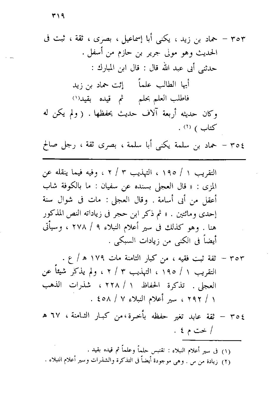 353 - حَمَّاد بن زيد يكنى أَبَا إِسْمَاعِيل بصرى ثِقَة ثَبت فِي الحَدِيث وَهُوَ مولى جرير بن حَازِم من أَسْفَل حَدثنِي أبي عبد الله قَالَ قَالَ بن الْمُبَارك أَيهَا الطَّالِب علما إئت حَمَّاد بن زيد فاطلب الْعلم بحلم ثمَّ قَيده بِقَيْد وَكَانَ حَدِيثه أَرْبَعَة آلَاف حَدِيث يحفظها وَلم يكن لَهُ كتاب