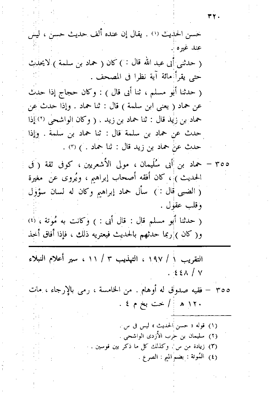 355 - حَمَّاد بن أبي سُلَيْمَان مولى الْأَشْعَرِيين كوفى ثِقَة فِي الحَدِيث كَانَ أفقه أَصْحَاب إِبْرَاهِيم ويروى عَن مُغيرَة الضَّبِّيّ قَالَ سَأَلَ حَمَّاد إِبْرَاهِيم وَكَانَ لَهُ لِسَان سؤول وقلب عقول حَدثنَا أَبُو مُسلم قَالَ قَالَ أبي وَكَانَت بِهِ موتَة وَكَانَ رُبمَا حَدثهمْ بِالْحَدِيثِ فيعتريه ذَلِك فَإِذا أَفَاق أَخذ