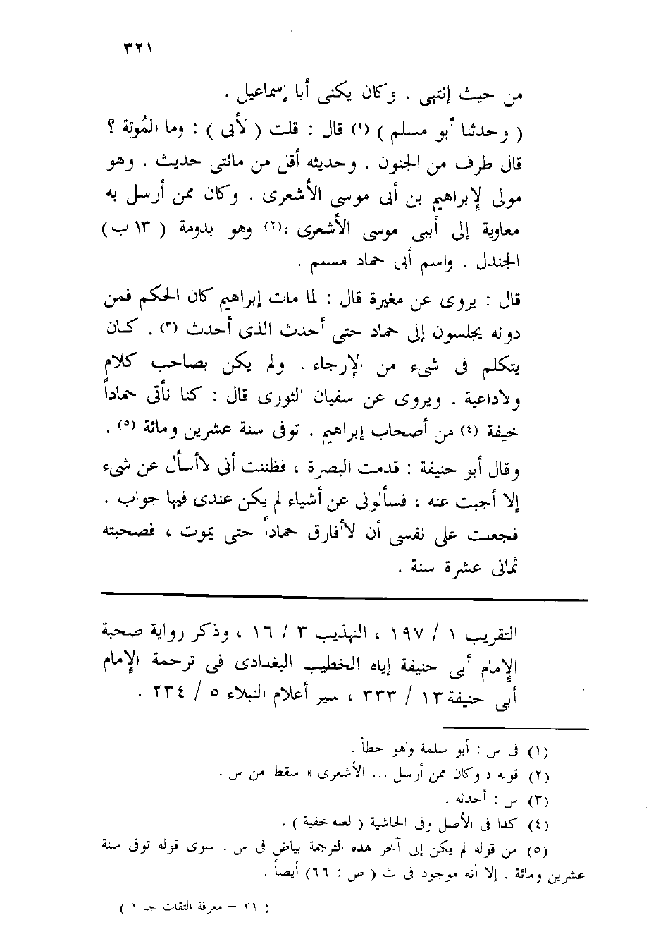 من حَيْثُ انْتهى وَكَانَ يكنى أَبَا إِسْمَاعِيل وَحدثنَا أَبُو مُسلم قَالَ قلت لأبي وَمَا الموتة قَالَ طرف من الْجُنُون وَحَدِيثه أقل من مِائَتي حَدِيث وَهُوَ مولى لإِبْرَاهِيم بن أبي مُوسَى الْأَشْعَرِيّ وَكَانَ مِمَّن أرسل بِهِ مُعَاوِيَة إِلَى أَبى مُوسَى الْأَشْعَرِيّ وَهُوَ بدومة الجندل وَاسم أبي حَمَّاد مُسلم قَالَ يرْوى عَن مُغيرَة قَالَ لما مَاتَ إِبْرَاهِيم كَانَ الحكم فَمن دونه يَجْلِسُونَ إِلَى حَمَّاد حَتَّى أحدث الَّذِي أحدث كَانَ يتَكَلَّم فِي شَيْء من الإرجاء وَلم يكن بِصَاحِب كَلَام وَلَا دَاعِيَة ويروى عَن سُفْيَان الثَّوْريّ قَالَ كُنَّا نأتي حمادا خيفة من أَصْحَاب إِبْرَاهِيم توفى سنة عشْرين وَمِائَة وَقَالَ أَبُو حنيفَة قدمت الْبَصْرَة فَظَنَنْت أَنى لَا أسأَل عَن شَيْء إِلَّا أجبْت عَنهُ فسألونى عَن أَشْيَاء لم يكن عِنْدِي فِيهَا جَوَاب فَجعلت على نَفسِي أَن لَا أُفَارِق حمادا حَتَّى يَمُوت فصحبته ثَمَانِي عشرَة سنة