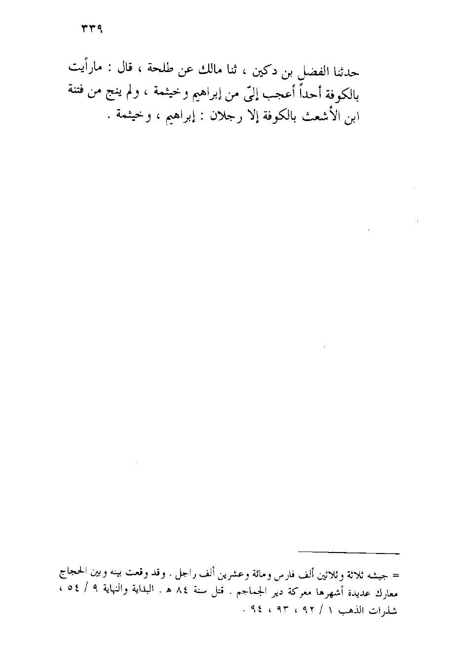 حَدثنَا الْفضل بن دُكَيْن ثَنَا مَالك عَن طَلْحَة قَالَ مَا رَأَيْت بِالْكُوفَةِ أحدا أعجب إِلَى من إِبْرَاهِيم وخيثمة وَلم ينج من فتْنَة بن الْأَشْعَث بِالْكُوفَةِ إِلَّا رجلَانِ إِبْرَاهِيم وخيثمة