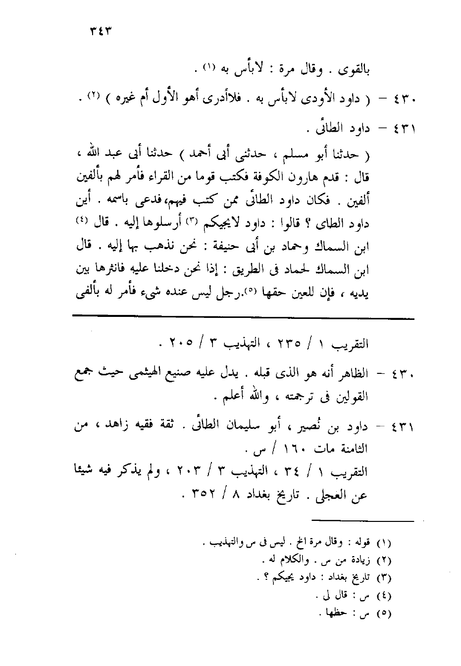 431 - دَاوُد الطَّائِي حَدثنَا أَبُو مُسلم حَدثنِي أبي أَحْمد حَدثنَا أبي عبد الله قَالَ قدم هَارُون الْكُوفَة فَكتب قوما من الْقُرَّاء فَأمر لَهُم بِأَلفَيْنِ أَلفَيْنِ فَكَانَ دَاوُد الطَّائِي مِمَّن كتب فيهم فدعى باسمه أَيْن دَاوُد الطاى قَالُوا دَاوُد لَا يجيكم أرسلوها إِلَيْهِ قَالَ بن السماك وَحَمَّاد بن أبي حنيفَة نَحن نَذْهَب بهَا إِلَيْهِ قَالَ بن السماك لحماد فِي الطَّرِيق إِذا نَحن دَخَلنَا عَلَيْهِ فانثرها بَين يَدَيْهِ فَإِن للعين حَقّهَا رجل لَيْسَ عِنْده شَيْء فَأمر لَهُ بألفى دِرْهَم يردهَا فَلَمَّا دخلُوا عَلَيْهِ نثروها بَين يَدَيْهِ قَالَ سوءة إِنَّمَا يفعل هَذَا بالصبيان فَأبى أَن يقبلهَا حَدثنِي أبي عبد الله حَدثنِي أَبُو خَالِد الْأَحْمَر ومررت أَنا وسُفْيَان الثَّوْريّ بمنزل دَاوُد الطاى فَقَالَ لي سُفْيَان ادخل بِنَا نسلم عَلَيْهِ فَدَخَلْنَا عَلَيْهِ فَمَا احتفل لِسُفْيَان وَلَا انبسط إِلَيْهِ فَلَمَّا خرجنَا قلت يَا أَبَا عبد الله غاظنى مَا صنع بك قَالَ وإيش صنع بِي قلت لم يحفلك وَلم ينبسط إِلَيْك قَالَ إِن أَبَا سُلَيْمَان لَا يتهم فِي مودته أما رَأَيْت عَيْنَيْهِ هَذَا فِي شَيْء غير الَّذِي نَحن فِيهِ