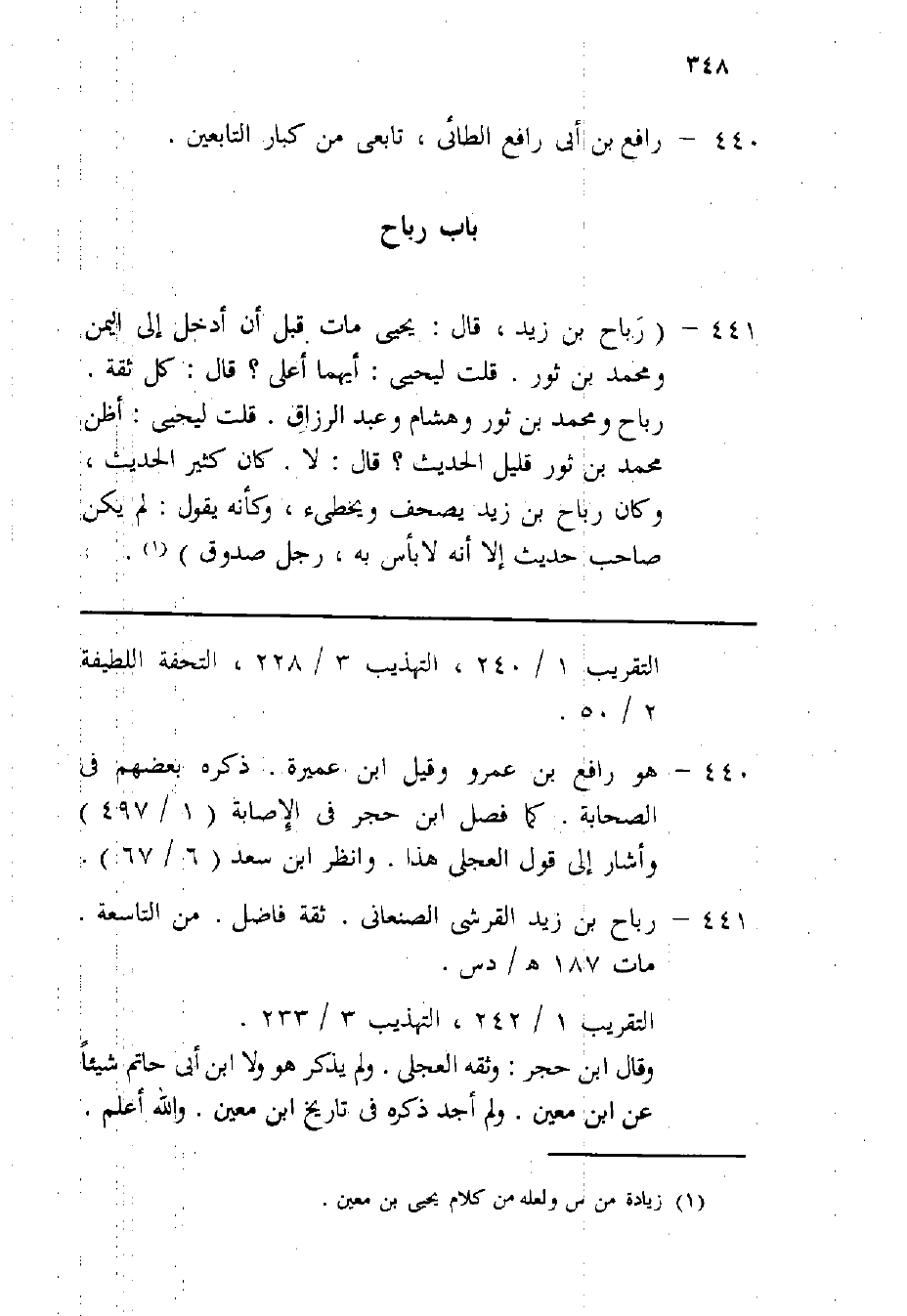 441 - رَبَاح بن زيد قَالَ يحيى مَاتَ قبل أَن أَدخل إِلَى الْيمن وَمُحَمّد بن ثَوْر قلت ليحيى أَيهمَا أَعلَى قَالَ كل ثِقَة رَبَاح وَمُحَمّد بن ثَوْر وَهِشَام وَعبد الرَّزَّاق قلت ليحيى أَظن مُحَمَّد بن ثَوْر قَلِيل الحَدِيث قَالَ لَا كَانَ كثير الحَدِيث وَكَانَ رَبَاح بن زيد يصحف ويخطىء وَكَأَنَّهُ يَقُول لم يكن صَاحب حَدِيث إِلَّا أَنه لَا بَأْس بِهِ رجل صَدُوق