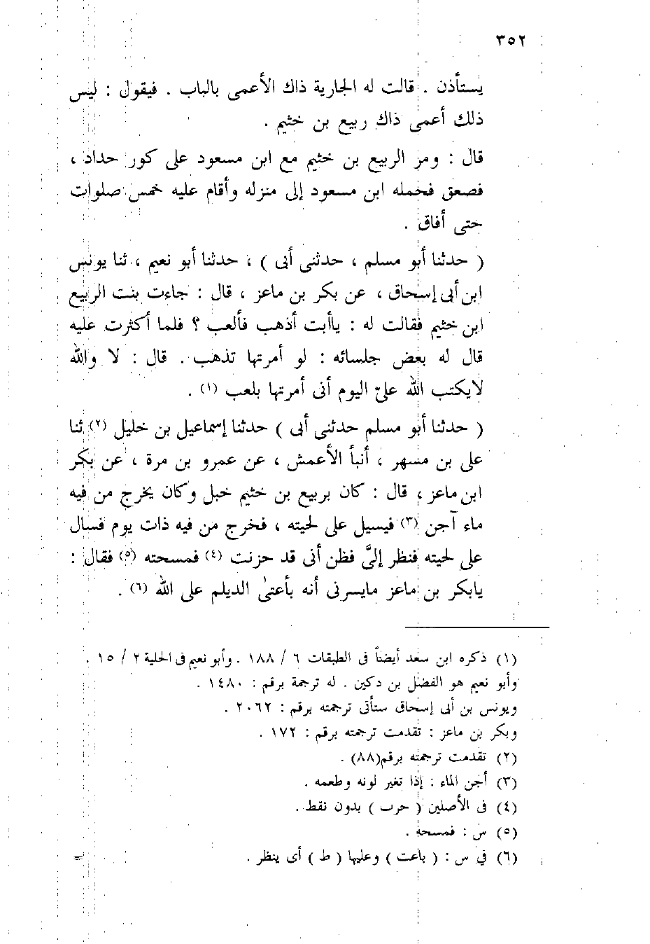 يسْتَأْذن قَالَت لَهُ الْجَارِيَة ذَاك الْأَعْمَى بِالْبَابِ فَيَقُول لَيْسَ ذَلِك أعمى ذَاك ربيع بن خثيم قَالَ وَمر الرّبيع بن خثيم مَعَ بن مَسْعُود على كور حداد فَصعِقَ فَحَمله بن مَسْعُود إِلَى منزله وَأقَام عَلَيْهِ خمس صلوَات حَتَّى أَفَاق حَدثنَا أَبُو مُسلم حَدثنِي أبي حَدثنَا أَبُو نعيم ثَنَا يُونُس بن أبي إِسْحَاق عَن بكر بن مَاعِز قَالَ جَاءَت بنت الرّبيع بن خثيم فَقَالَت لَهُ يَا أَبَت أذهب فألعب فَلَمَّا أكثرت عَلَيْهِ قَالَ لَهُ بعض جُلَسَائِهِ لَو أَمَرتهَا تذْهب قَالَ لَا وَالله لَا يكْتب الله على الْيَوْم أَنى امرتها بلعب حَدثنَا أَبُو مُسلم حَدثنِي أبي حَدثنَا إِسْمَاعِيل بن خَلِيل ثَنَا على بن مسْهر أنبأ الْأَعْمَش عَن عَمْرو بن مرّة عَن بكر بن مَاعِز قَالَ كَانَ بربيع بن خثيم خبل وَكَانَ يخرج من فِيهِ مَاء آجن فيسيل على لحيته فَخرج من فِيهِ ذَات يَوْم فَسَالَ على لحيته فَنظر إِلَى فَظن أَنى قد حزنت فمسحته فَقَالَ يَا بكر بن مَاعِز مَا يسرني أَنه بأعتى الديلم على الله