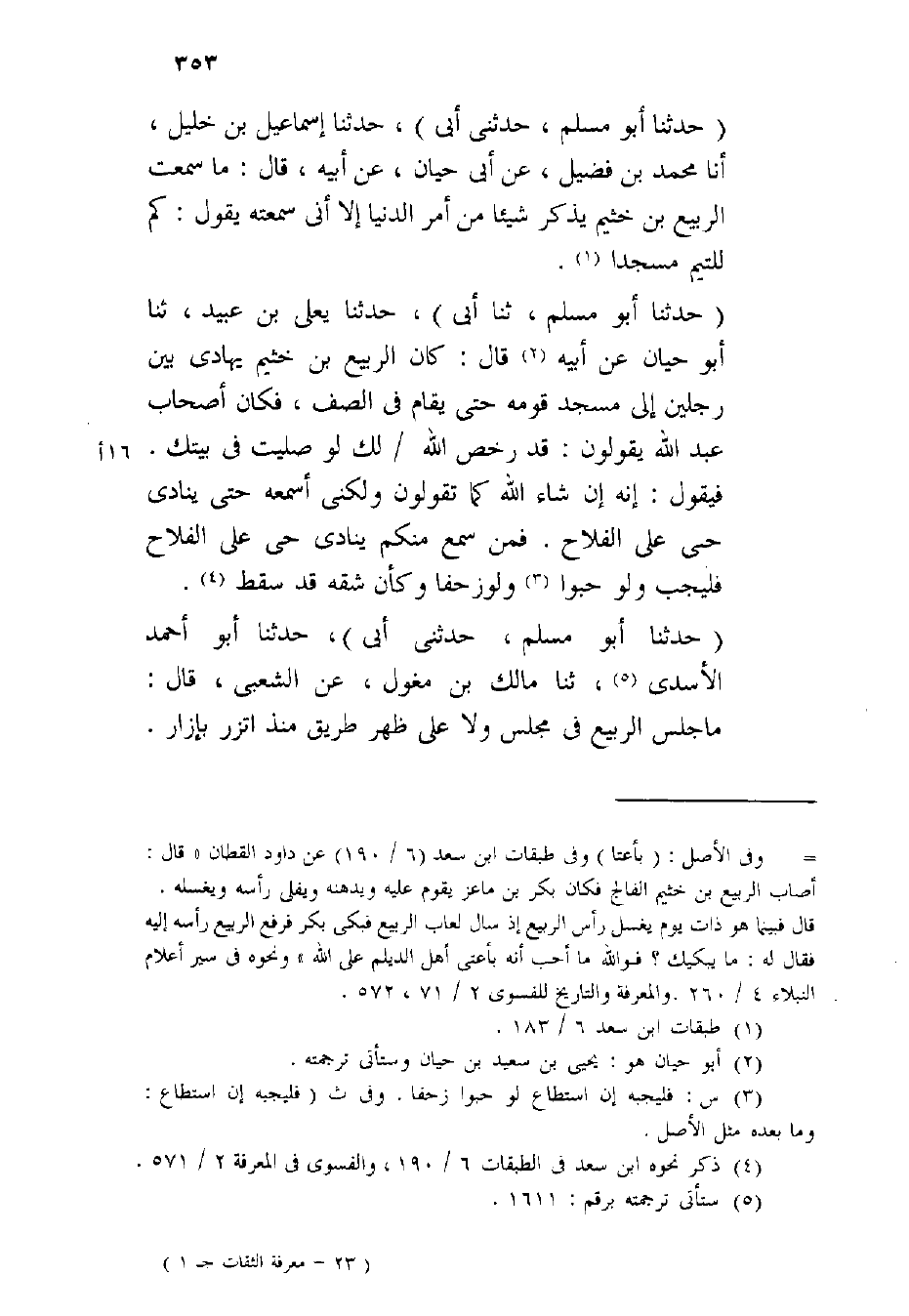 حَدثنَا أَبُو مُسلم حَدثنِي أبي حَدثنَا إِسْمَاعِيل بن خَلِيل أَنا مُحَمَّد بن فُضَيْل عَن أبي حَيَّان عَن أَبِيه قَالَ مَا سَمِعت الرّبيع بن خثيم يذكر شَيْئا من أَمر الدُّنْيَا إِلَّا أَنى سمعته يَقُول كم للتيم مَسْجِدا حَدثنَا أَبُو مُسلم ثَنَا أبي حَدثنَا يعلى بن عبيد ثَنَا أَبُو حَيَّان عَن أَبِيه قَالَ كَانَ الرّبيع بن خثيم يهادى بَين رجلَيْنِ إِلَى مَسْجِد قومه حَتَّى يُقَام فِي الصَّفّ فَكَانَ أَصْحَاب عبد الله يَقُولُونَ قد رخص الله لَك لَو صليت فِي بَيْتك فَيَقُول إِنَّه إِن شَاءَ الله كَمَا تَقولُونَ وَلَكِنِّي أسمعهُ حَتَّى يُنَادى حَيّ على الْفَلاح فَمن سمع مِنْكُم يُنَادى حَيّ على الْفَلاح فليجب وَلَو حبوا وَلَو زحفا وَكَأن شقَّه قد سقط حَدثنَا أَبُو مُسلم حَدثنِي أبي حَدثنَا أَبُو أَحْمد الْأَسدي ثَنَا مَالك بن مغول عَن الشّعبِيّ قَالَ مَا جلس الرّبيع فِي مجْلِس وَلَا على ظهر طَرِيق مُنْذُ اتزر بإزار قَالَ أَخَاف أَن يظلم رجل فأتخلف عَن الشَّهَادَة عَلَيْهِ أَو تقع حاملة عَن حاملها فَلَا أحمل عَلَيْهِ أَو يسلم على فَلَا أرد السَّلَام أَو لَا أَغضّ الْبَصَر أَو لَا أهْدى السبل قَالَ فَكُنَّا ندخل عَلَيْهِ فِي بَيته حَدثنَا أَبُو مُسلم حَدثنِي أبي حَدثنَا أَبُو نعيم ثَنَا سُفْيَان عَن مَنْصُور عَن إِبْرَاهِيم أَخْبرنِي من صحب الرّبيع بن خثيم عشْرين سنة فَمَا سمع كلمة تعاب