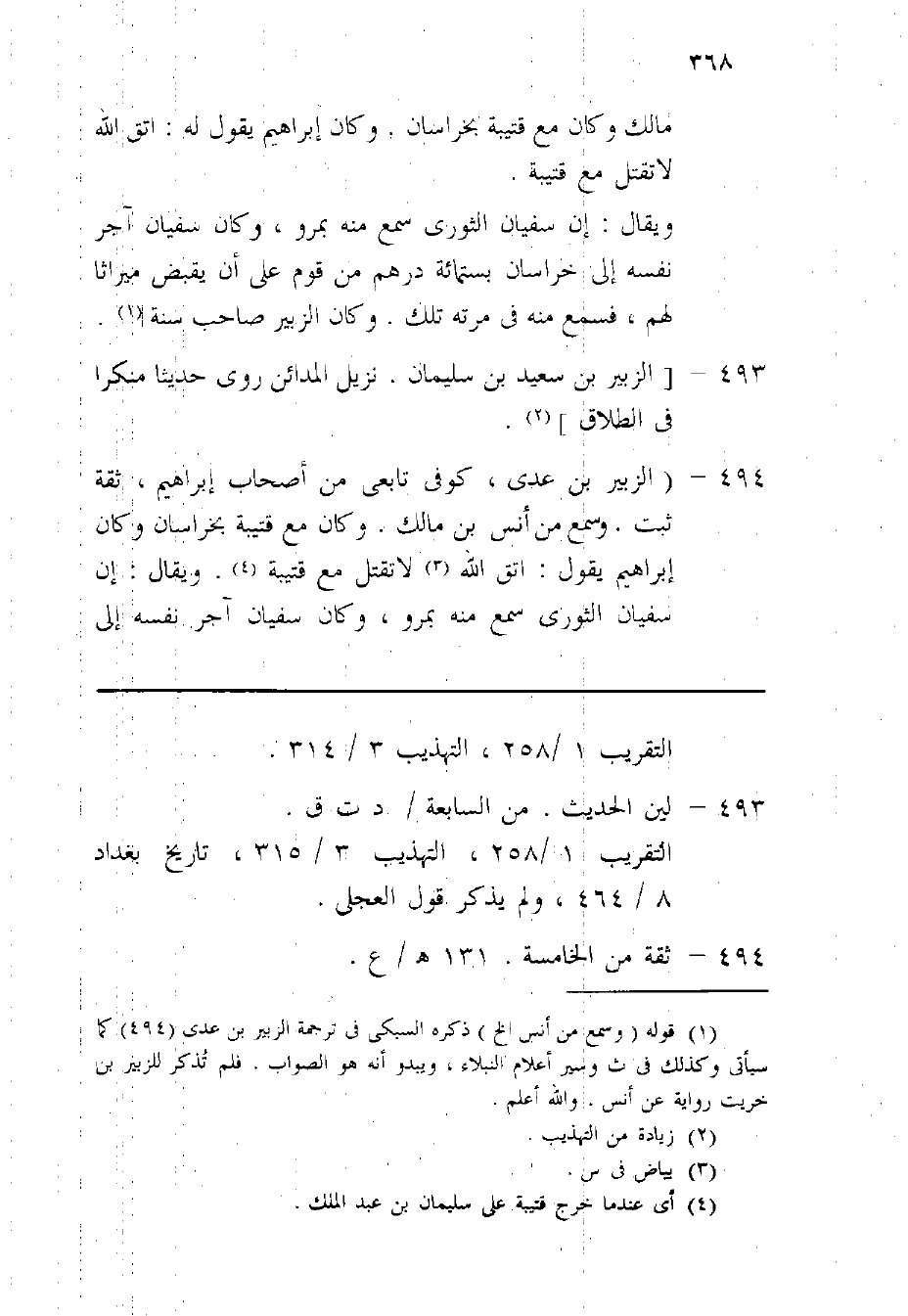 494 - الزبير بن عدى كوفى تَابِعِيّ من أَصْحَاب إِبْرَاهِيم ثِقَة ثَبت وَسمع من أنس بن مَالك وَكَانَ مَعَ قُتَيْبَة بخراسان وَكَانَ إِبْرَاهِيم يَقُول اتَّقِ الله لَا تقتل مَعَ قُتَيْبَة وَيُقَال إِن سُفْيَان الثَّوْريّ سمع مِنْهُ بمرو وَكَانَ سُفْيَان آجر نَفسه إِلَى خُرَاسَان بستمائة دِرْهَم من قوم على أَن يقبض مِيرَاثا لَهُم فَسمع مِنْهُ فِي مرته بذلك وَكَانَ الزبير صَاحب سنة