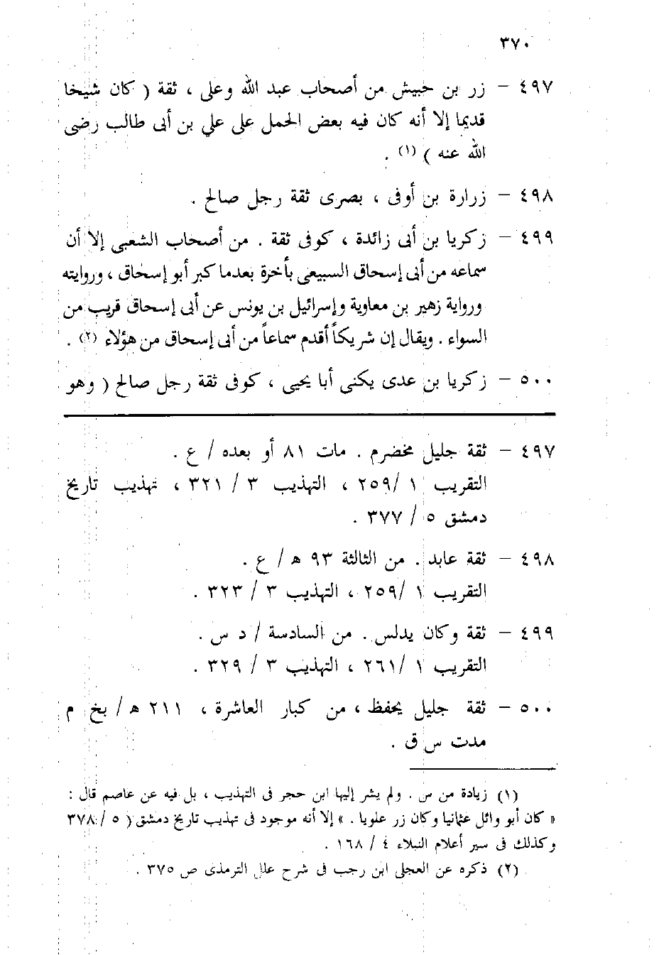 497 - زر بن حُبَيْش من أَصْحَاب عبد الله وعَلى ثِقَة كَانَ شَيخا قَدِيما إِلَّا أَنه كَانَ فِيهِ بعض الْحمل على عَليّ بن أبي طَالب رَضِي الله عَنهُ