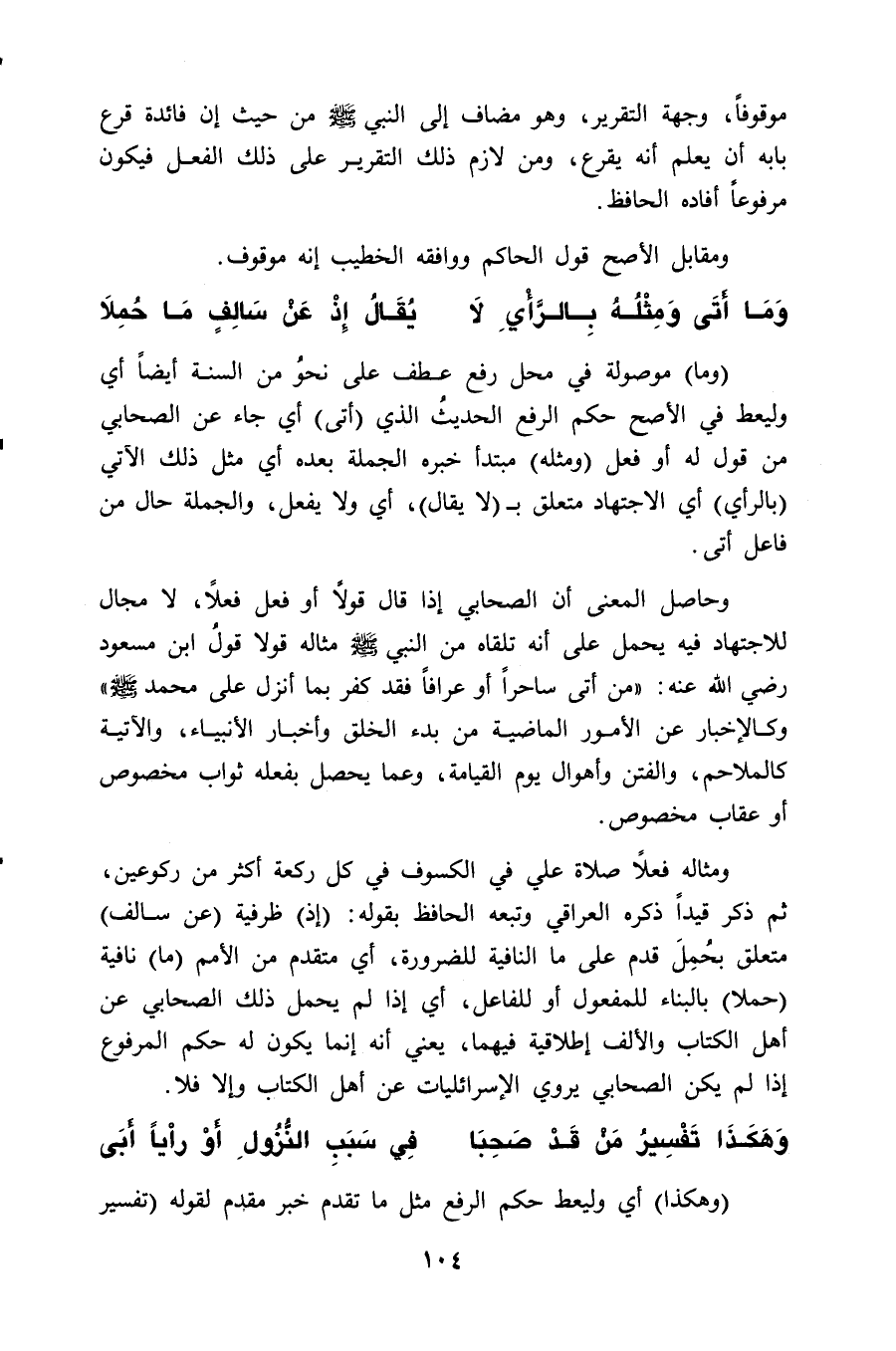 (وما) موصولة في محل رفع عطف على نحوُ من السنة أيضاً أي وليعط في الأصح حكم الرفع الحديثُ الذي (أتى) أي جاء عن الصحابي من قول له أو فعل (ومثله) مبتدأ خبره الجملة بعده أي مثل ذلك الآتي (بالرأي) أي الاجتهاد متعلق بـ (لا يقال)، أي ولا يفعل، والجملة حال من فاعل أتى.