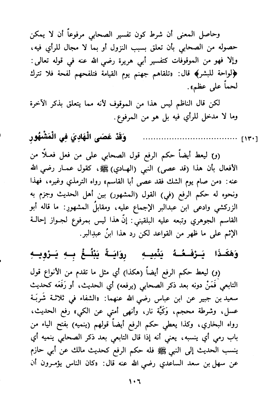 (و) ليعط أيضاً حكم الرفع قول الصحابي على من فعل فعلاً من الأفعال بأن هذا (قد عصى) النبي (الهادي) - صلى الله عليه وسلم -، كقول عمار - رضي الله عنه -: " من صام يوم الشك فقد عصى أبا القاسم " رواه الترمذي وغيره، فهذا ونحوه له حكم الرفع (في) القول (المشهور) بين أهل الحديث وجزم به الزركشي وادعى ابن عبد البر الإجماع عليه، ومقابلُ المشهورِ: ما قاله أبو القاسم الجوهري وتبعه عليه البلقيني: إنّ هذا ليس بمرفوع لجواز إحالة الإثم على ما ظهر من القواعد لكن رد هذا ابنُ عبد ِالبر.