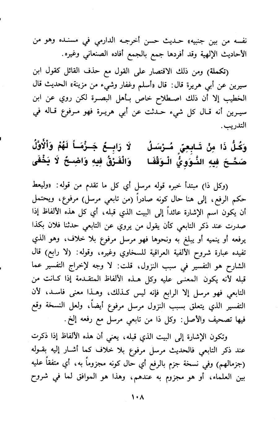 (وكل ذا) مبتدأ خبره قوله مرسلِ أي كل ما تقدم من قوله: " وليعط حكم الرفع، إلى هنا حال كونه صادراَ (من تابعي مرسل) مرفوع، ويحتمل أن يكون اسم الإشارة عائداً إلى البيت الذي قبله، أي كل هذه الألفاظ إذا صدرت عند ذكر التابعي كأن يقول من يروي عن التابعي حدثنا فلان بكذا يرفعه أو ينميه أو يبلغ به ونحوها فهو مرسل مرفوع بلا خلاف، وهو الذي تفيده عبارة شروح الألفية العراقية للسخاوي وغيره. وقوله: (لا رابع) قال الشارح هو التفسير في سبب النزول، قلت: لا وجه لإخراج التفسير عما قبله لأنه يكون المعنى عليه وكل هذه الألفاظ المتقدمة إذا كانت من التابعي فهو مرسل إلا الرابع فإنه ليس كذلك، وهذا معنى فاسد، لأن التفسير الذي يتعلق بسبب النزول مرسل مرفوع أيضاً، ولعل النسخة وقع فيها تصحيف والأصل: وكل ذا من تابعي مرسل مع رفعه إلخ.