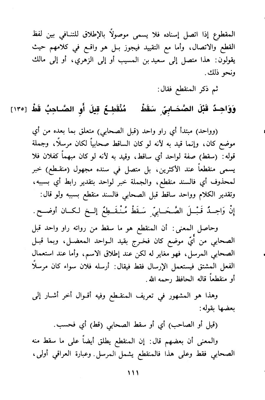 وحاصل المعنى: أن المنقطع هو ما سقط من رواته راو واحد قبل الصحابي من أيّ موضع كان فخرج بقيد الواحد المعضل، وبما قبل الصحابي المرسل، فهو مغاير له لكن عند إطلاق الاسم، وأما عند استعمال الفعل المشتق فيستعمل الإرسال فقط فيقال: أرسله فلان سواء كان مرسلاً أو منقطعاً قاله الحافظ رحمه الله.