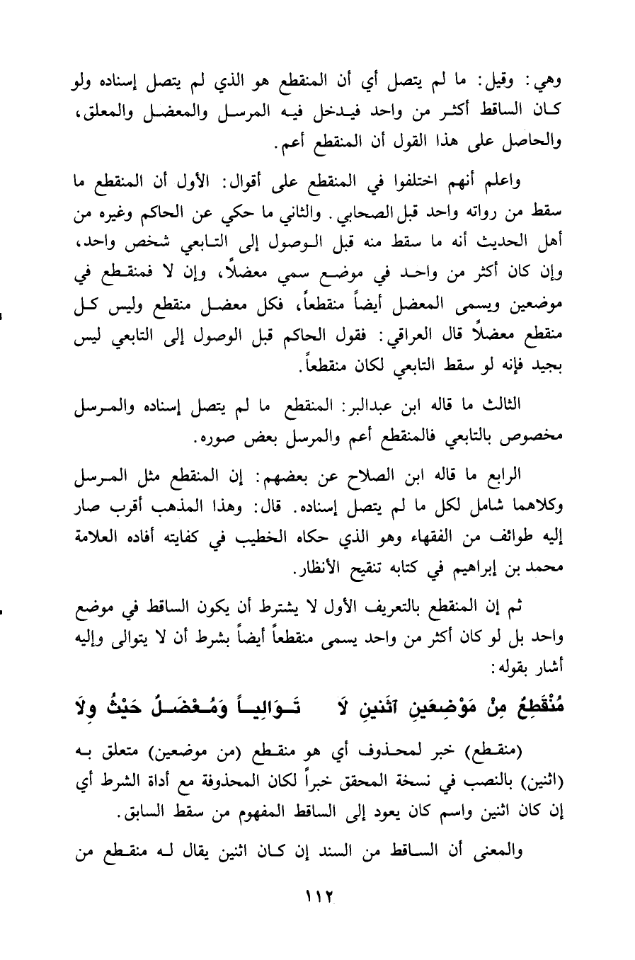 واعلم أنهم اختلفوا في المنقطع على أقوال: الأول أن المنقطع ما سقط من رواته واحد قبل الصحابي. والثاني ما حكي عن الحاكم وغيره من أهل الحديث أنه ما سقط منه قبل الوصول إلى التابعي شخص واحد، وإن كان أكثر من واحد في موضع سمي معضلاً، وإن لا فمنقطع في موضعين ويسمى المعضل أيضاً منقطعاً، فكل معضل منقطع وليس كل منقطع معضلاً قال العراقي: فقول الحاكم قبل الوصول إلى التابعي ليس بجيد فإنه لو سقط التابعي لكان منقطعاً.