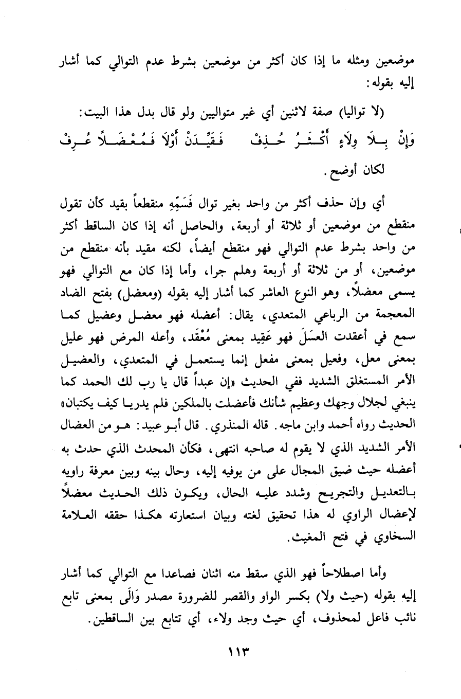 وَإنْ بِلَا وِلَاءٍ أكْثَرُ حُذِفْ ... فَقَيِّدَنْ أوْلاَ فَمُعْضَلاً عُرِفْ