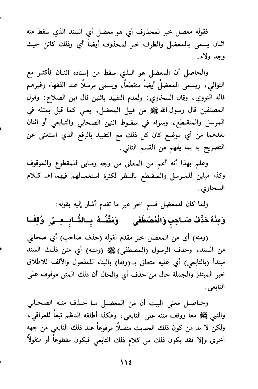 وحاصل معنى البيت أن من المعضل ما حذف منه الصحابي والنبي - صلى الله عليه وسلم - معاً ووقف متنه على التابعي، وهكذا أطلقه الناظم تبعاً للعراقي، ولكن لا بد من كون ذلك الحديث متصلاً مرفوعاً عند ذلك التابعي من جهة أخرى وإلا فقد يكون ذلك من كلام ذلك التابعي فيكون مقطوعاً أو منقولاً