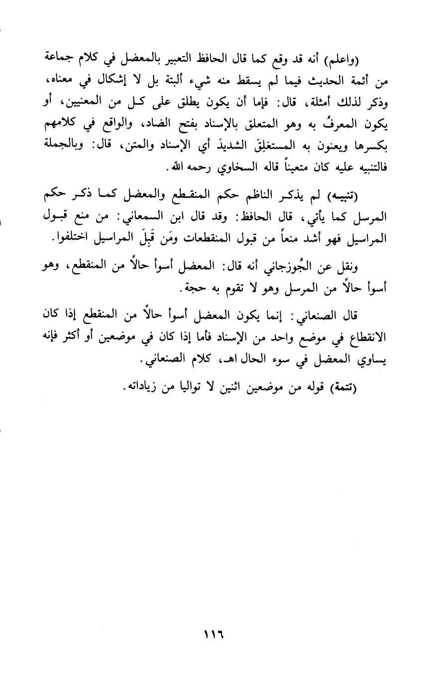 (تنبيه) لم يذكر الناظم حكم المنقطع والمعضل كما ذكر حكم المرسل كما يأتي، قال الحافظ: وقد قال ابن السمعاني: من منع قبول المراسيل فهو أشد منعاً من قبول المنقطعات ومَن قَبِلَ المراسيل اختلفوا.