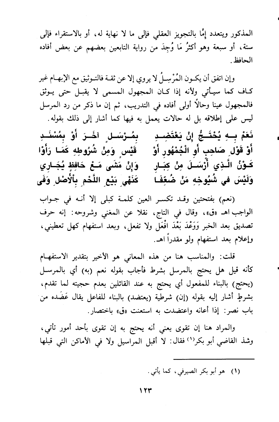 قلت: والمناسب هنا من هذه المعاني هو الأخير بتقدير الاستفهام كأنه قيل هل يحتج بالمرسل بشرط فأجاب بقوله نعم (به) أي بالمرسل (يحتج) بالبناء للمفعول أي يحتج به عند القائلين بعدم حجيته لما تقدم، بشرطٍ أشار إليه بقوله (إن) شرطية (يعتضد) بالبناء للفاعل يقال عَضَده من باب نصر: إذا أعانه واعتضدت به استعنت (ق) باختصار.