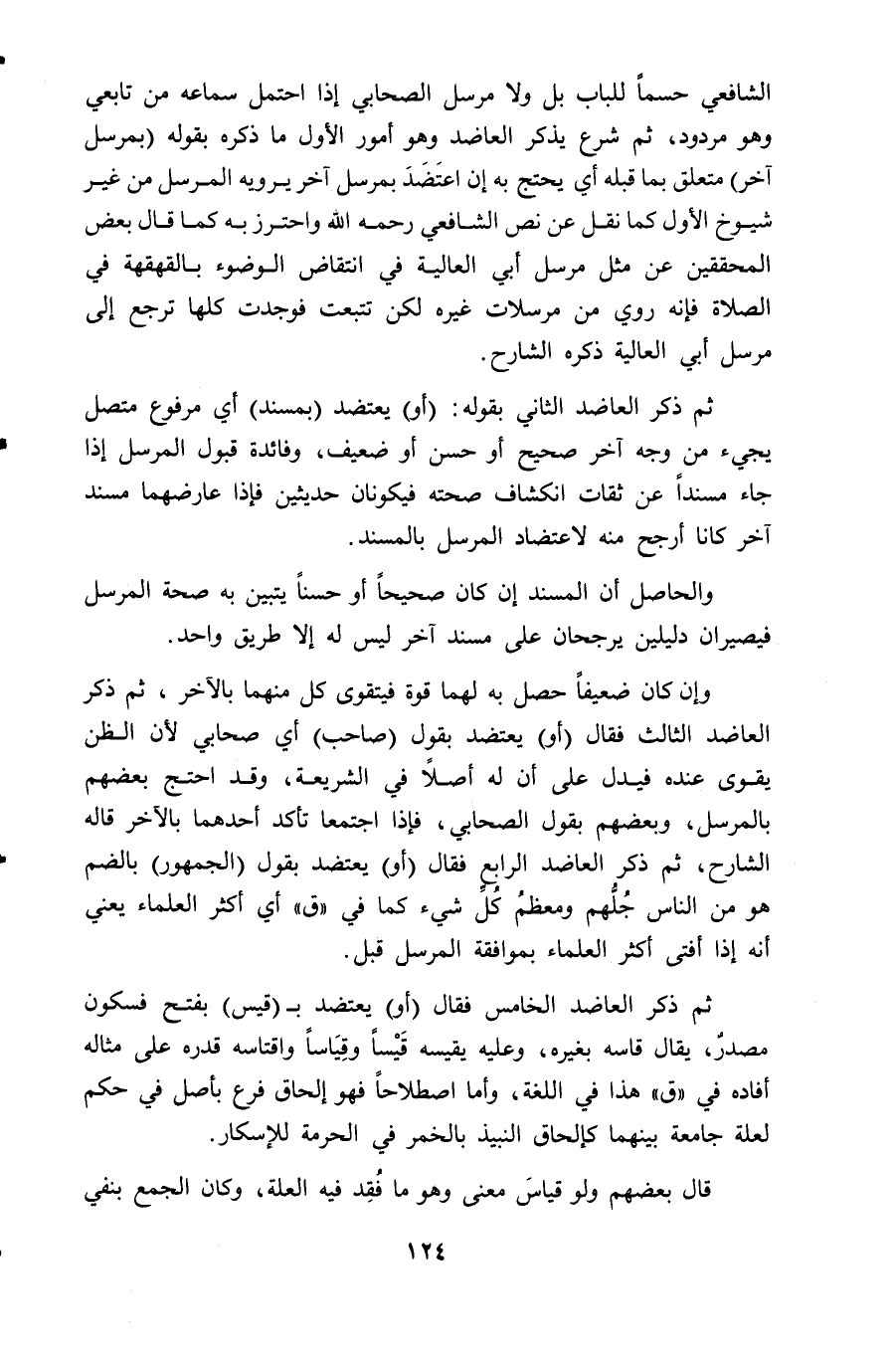 الشافعي حسماً للباب بل ولا مرسل الصحابي إذا احتمل سماعه من تابعي وهو مردود، ثم شرع يذكر العاضد وهو أمور الأول ما ذكره بقوله (بمرسل آخر) متعلق بما قبله أي يحتج به إن اعتَضَدَ بمرسل آخر يرويه المرسل من غير شيوخ الأول كما نقل عن نص الشافعي رحمه الله واحترز به كما قال بعض المحققين عن مثل مرسل أبي العالية في انتقاض الوضوء بالقهقهة في الصلاة فإنه روي من مرسلات غيره لكن تتبعت فوجدت كلها ترجع إلى مرسل أبي العالية ذكره الشارح.