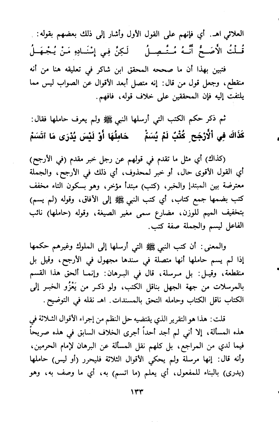 والمعنى: أن كتب النبي - صلى الله عليه وسلم - التي أرسلها إلى الملوك وغيرهم حكمها إذا لم يسم حاملها أنها متصلة في سندها مجهول في الأرجح، وقيل بل منقطعة، وقيل: بل مرسلة، قال في البرهان: وإنما ألحق هذا القسم بالمرسلات من جهة الجهل بناقل الكتب، ولو ذكر من يَعْزُو الخبر إلى الكتاب ناقل الكتاب وحامله التحق بالمسندات. اهـ نقله في التوضيح.