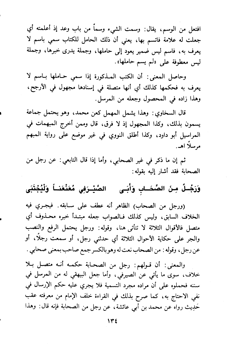 والمعنى: أن قولهم: رجل من الصحابة حكمه أنه متصل بلا خلاف، سوى ما يأتي عن الصيرفي، وأما جعل البيهقي له من المرسل في سننه فحملوه على أن مراده مجرد التسمية فلا يجري عليه حكم الإرسال في نفي الاحتاج به، كما صرح بذلك في القراءة خلف الإمام من معرفته عقب حَدِيث رواه عن محمد بن أبي عائشة، عن رجل من الصحابة فإنه قال: وهذا