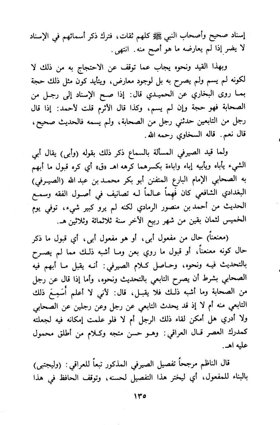 (معنعناً) حال من مفعول أبى، أو هو مفعول أبى، أي قبول ما ذكر حال كونه معنعناً، أو قبول ما روي بعن وما أشبه ذلك مما لم يصرح بالتحديث فيه ونحوه، وحاصل كلام الصيرفي: أنه يقبل ما أبهم فيه الصحابي بشرط أن يصرح التابعي بالتحديث ونحوه، وأما إذا قال عن رجل من الصحابة وما أشبه ذلك فلا يقبل، قال: لأني لا أعلم أسَمِعَ ذلك التابعي منه أم لا إذ قد يحدث التابعي عن رجل وعن رجلين عن الصحابي ولا أدري هل أمكن لقاء ذلك الرجل أم لا فلو علمت إِمكانه فيه لجعلته كمدرك العصر قال العراقي: وهو حسن متجه وكلام من أطلق محمول عليه اهـ.