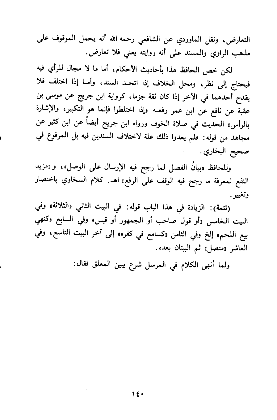 لكن خص الحافظ هذا بأحاديث الأحكام، أما ما لا مجال للرأي فيه فيحتاج إلى نظر، ومحل الخلاف إذا اتحد السَّند، وأما إذا اختلف فلا يقدح أحدهما في الآخر إذا كان ثقة جزما، كرواية ابن جريجٍ عن موسى بن عقبة عن نافع عن ابن عمر رفعه " إذا اختلطوا فإنما هو التكبير، والإشارة بالرأس " الحديث في صلاة الخوف ورواه ابن جريجٍ أيضاً عن ابن كثير عن مجاهد من قوله: فلم يعدوا ذلك علة لاختلاف السَّندين فيه بل المرفوع في صحيح البخاري.