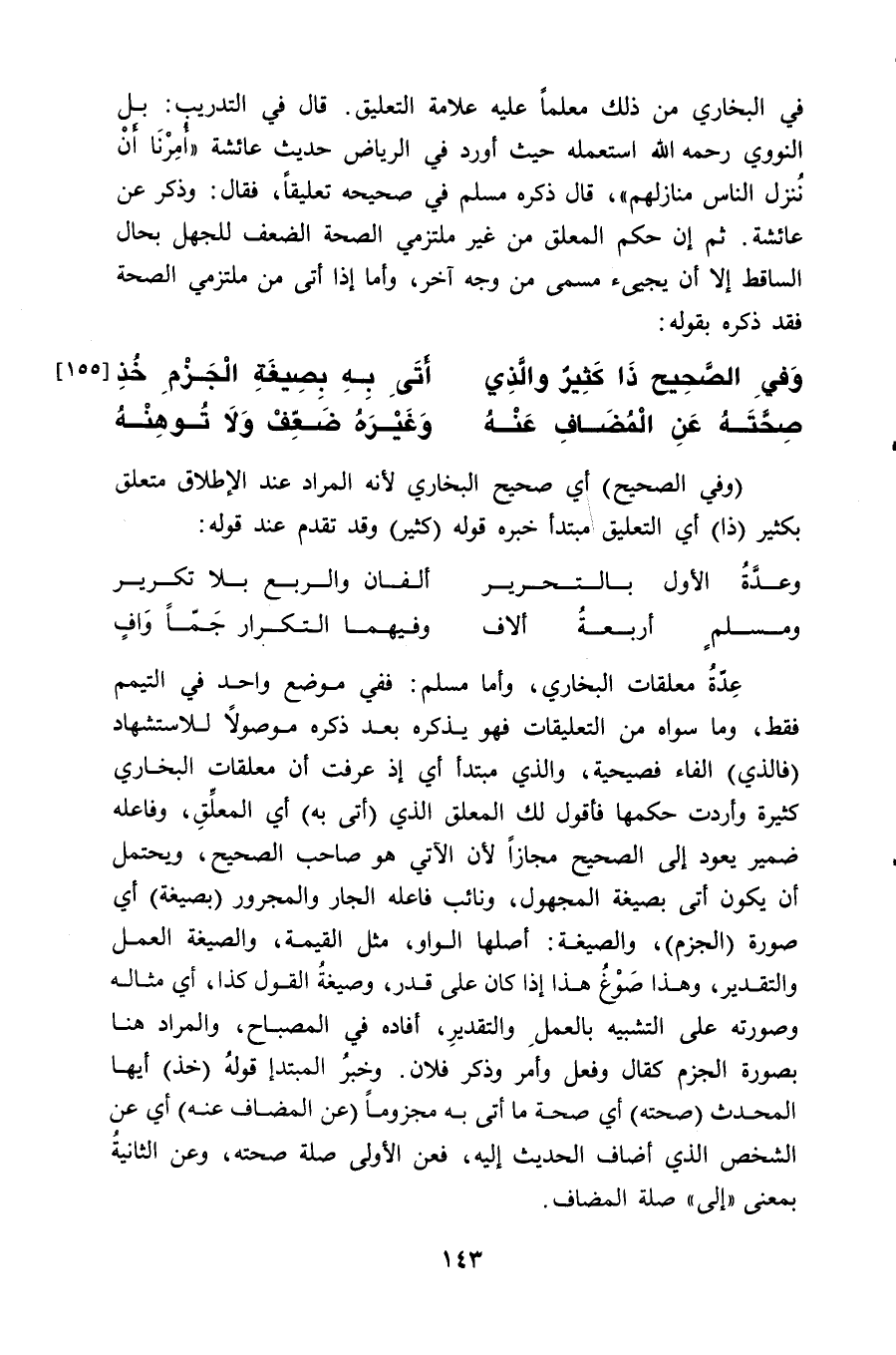 عِدّةُ معلقات البخاري، وأما مسلم: ففي موضع واحد في التيمم فقط، وما سواه من التعليقات فهو يذكره بعد ذكره موصولاً للاستشهاد (فالذي) الفاء فصيحية، والذي مبتدأ أي إذ عرفت أن معلقات البخاري كثيرة وأردت حكمها فأقول لك المعلق الذي (أتى به) أي المعلِّقِ، وفاعله ضمير يعود إلى الصَّحِيح مجازاً لأن الآتي هو صاحب الصَّحِيح، ويحتمل أن يكون أتى بصيغة المجهول، ونائب فاعله الجار والمجرور (بصيغة) أي صورة (الجزم)، والصيغة: أصلها الواو، مثل القيمة، والصيغة العمل والتقدير، وهذا صَوْغُ هذا إذا كان على قدر، وصيغةُ القول كذا، أي مثاله وصورته على التشبيه بالعملِ والتقديرِ، أفاده في المصباح، والمراد هنا بصورة الجزم كقال وفعل وأمر وذكر فلان. وخبرُ المبتدإ قولة (خذ) أيها المحدث (صحته) أي صحة ما أتى به مجزوماً (عن المضاف عنه) أي عن الشخص الذي أضاف الحديث إليه، فعن الأولى صلة صحته، وعن الثانية بمعنى " إلى " صلة المضاف.