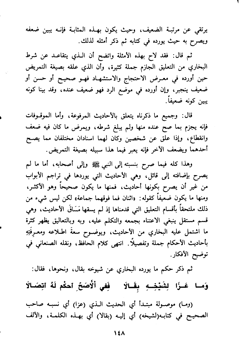 ثم قال: فقد لاح بهذه الأمثلة واتضح أن الذي يتقاعد عن شرط البخاري من التعليق الجازم جملة كثيرة، وأن الذي علقه بصيغة التمريض حين أورده في معرض الاحتجاج والاستشهاد فهو صحيح أو حسن أو ضعيف ينجبر، وإن أورده في موضع الرد فهو ضعيف عنده، وقد بينا كونه يبين كونه ضعيفاً.