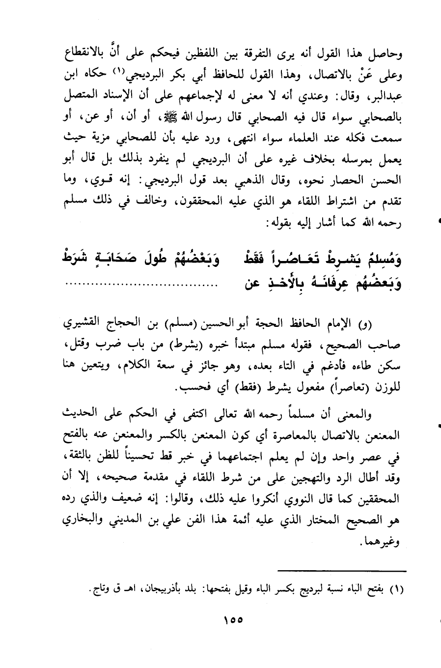 والمعنى أن مسلماً رحمه الله تعالى اكتفى في الحكم على الحديث المعنعن بالاتصال بالمعاصرة أي كون المعنعن بالكسر والمعنعن عنه بالفتح في عصر واحد وإن لم يعلم اجتماعهما في خبر قط تحسيناً للظن بالثقة، وقد أطال الرد والتهجين على من شرط اللقاء في مقدمة صحيحه، إلا أن المحققين كما قال النووي أنكروا عليه ذلك، وقالوا: إنه ضعيف والذي رده هو الصَّحِيح المختار الذي عليه أئمة هذا الفن علي بن المديني والبخاري وغيرهما.