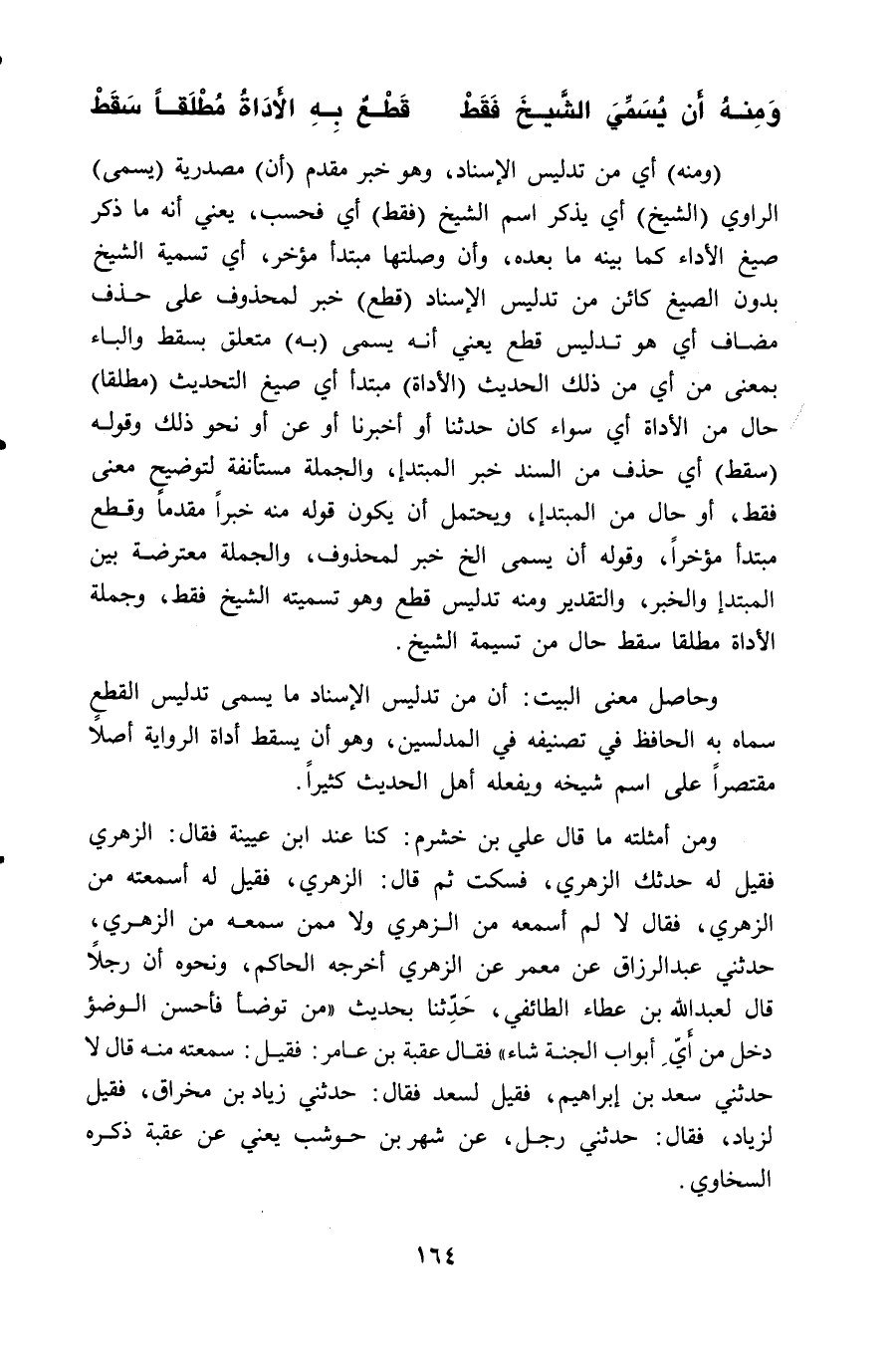 (ومنه) أي من تدليس الإسناد، وهو خبر مقدم (أن) مصدرية (يسمى) الراوي (الشيخ) أي يذكر اسم الشيخ (فقط) أي فحسب، يعني أنه ما ذكر صيغ الأداء كما بينه ما بعده، وأن وصلتها مبتدأ مؤخر، أي تسمية الشيخ بدون الصيغ كائن من تدليس الإسناد (قطع) خبر لمحذوف على حذف مضاف أي هو تدليس قطع يعني أنه يسمى (به) متعلق بسقط والباء بمعنى من أي من ذلك الحديث (الأداة) مبتدأ أي صيغ التحديث (مطلقا) حال من الأداة أي سواء كان حدثنا أو أخبرنا أو عن أو نحو ذلك وقوله (سقط) أي حذف من السَّند خبر المبتدإ، والجملة مستأنفة لتوضيح معنى فقط، أو حال من المبتدإ، ويحتمل أن يكون قوله منه خبراً مقدما وقطع مبتدأ مؤخراً، وقوله أن يسمى الخ خبر لمحذوف، والجملة معترضة بين المبتدإ والخبر، والتقدير ومنه تدليس قطع وهو تسميته الشيخ فقط، وجملة الأداة مطلقا سقط حال من تسيمة الشيخ.