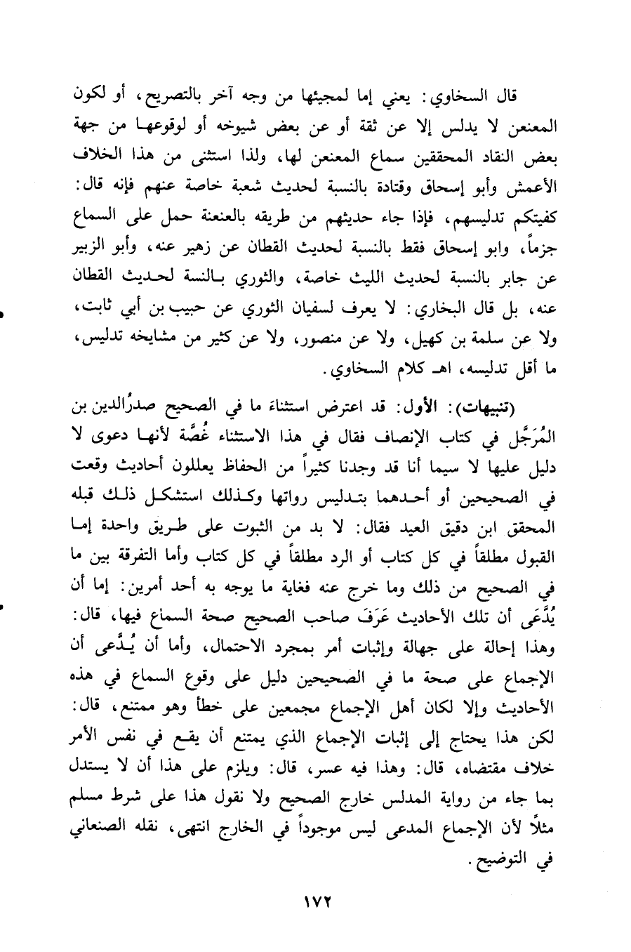 (تنبيهات): الأول: قد اعترض استثناءَ ما في الصَّحِيح صدرُ الدين بن المُرَجَّل في كتاب الإنصاف فقال في هذا الاستثناء غصَّة لأنها دعوى لا دليل عليها لا سيما أنا قد وجدنا كثيراً من الحفاظ يعللون أحاديث وقعت في الصَّحِيحين أو أحدهما بتدليس رواتها وكذلك استشكل ذلك قبله المحقق ابن دقيق العيد فقال: لا بد من الثبوت على طريق واحدة إما القبول مطلقاً في كل كتاب أو الرد مطلقاً في كل كتاب وأما التفرقة بين ما في الصَّحِيح من ذلك وما خرج عنه فغاية ما يوجه به أحد أمرين: إما أن يُدَّعَى أن تلك الأحاديث عَرَفَ صاحب الصَّحِيح صحة السطع فيها، قال: وهذا إحالة على جهالة وإثبات أمر بمجرد الاحتمال، وأما أن يُدَّعى أن الإجماع على صحة ما في الصَّحِيحين دليل على وقوع السماع في هذه الأحاديث وإلا لكان أهل الإجماع مجمعين على خطأ وهو ممتنع، قال: لكن هذا يحتاج إلى إثبات الإجماع الذي يمتنع أن يقع في نفس الأمر خلاف مقتضاه، قال: وهذا فيه عسر، قال: ويلزم على هذا أن لا يستدل بما جاء من رواية المدلس خارج الصَّحِيح ولا نقول هذا على شرط مسلم مثلاً لأن الإجماع المدعى ليس موجوداً في الخارج انتهى، نقله الصنعاني في التوضيح.