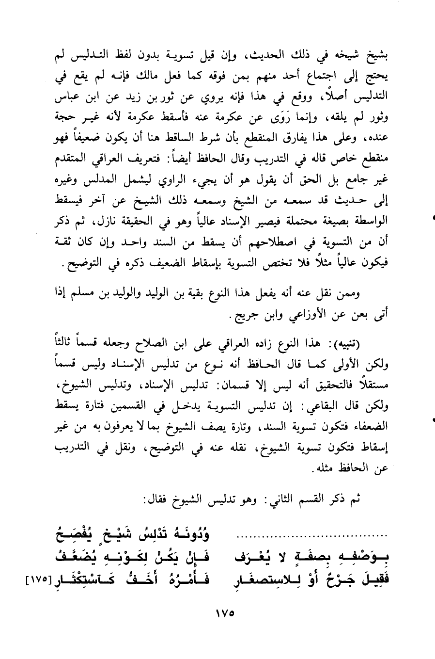 (تنبيه): هذا النوع زاده العراقي على ابن الصلاح وجعله قسماً ثالثاً ولكن الأولى كما قال الحافظ أنه نوع من تدليس الإسناد وليس قسماً مستقلاً فالتحقيق أنه ليس إلا قسمان: تدليس الإسناد، وتدليس الشيوخ، ولكن قال البقاعي: إن تدليس التسوية يدخل في القسمين فتارة يسقط الضعفاء فتكون تسوية السَّند، وتارة يصف الشيوخ بما لا يعرفون به من غير إسقاط فتكون تسوية الشيوخ، نقله عنه في التوضيح، ونقل في التدريب عن الحافظ مثله.