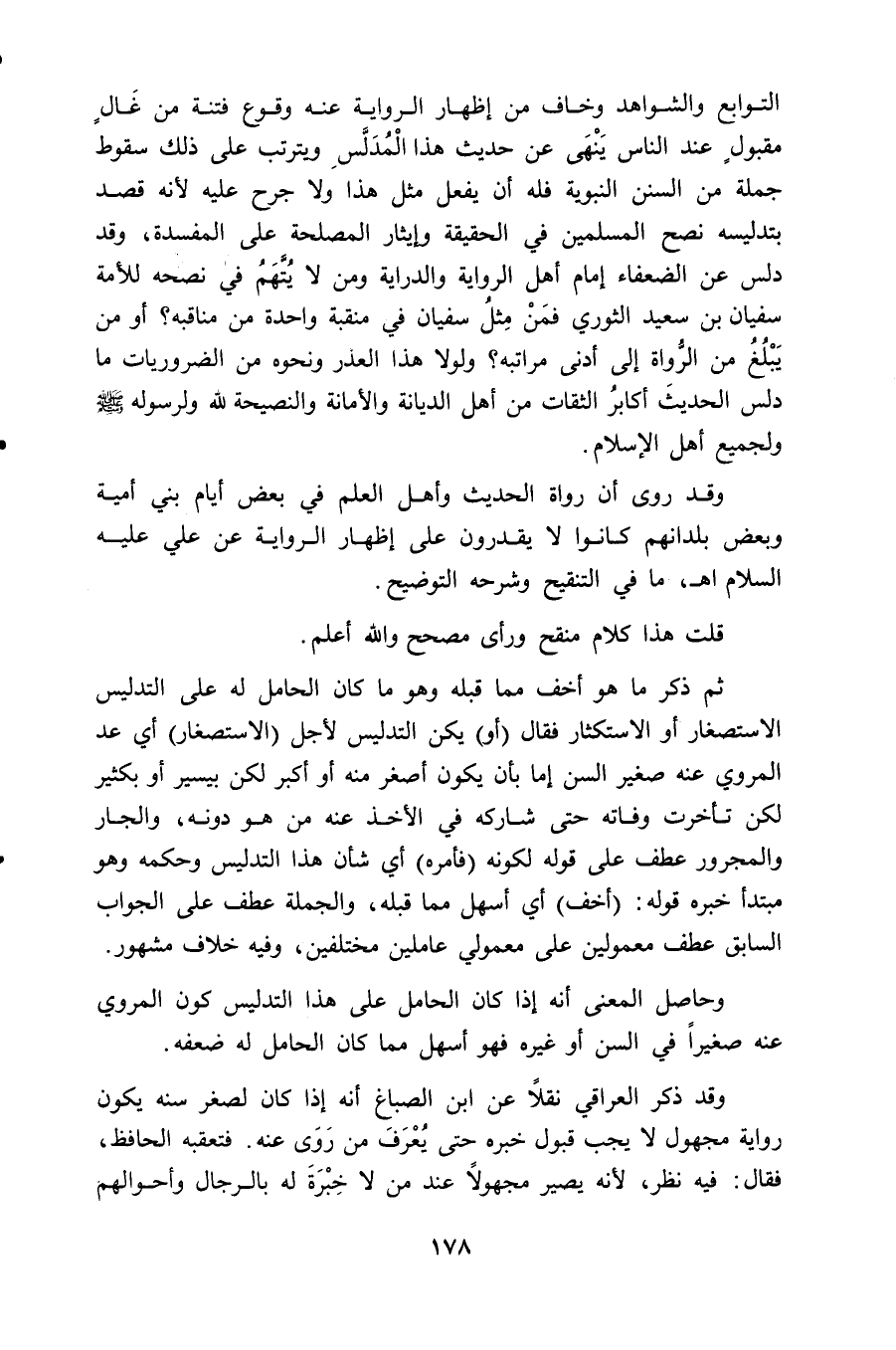 التوابع والشواهد وخاف من إظهار الرواية عنه وقوع فتنة من غَالٍ مقبولٍ عند النَّاس يَنْهَى عن حديث هذا الْمُدَلَّسِ ويترتب على ذلك سقوط جملة من السنن النبوية فله أن يفعل مثل هذا ولا جرح عليه لأنه قصد بتدليسه نصح المسلمين في الحقيقة وإيثار المصلحة على المفسدة، وقد دلس عن الضعفاء إمام أهل الرواية والدراية ومن لا يُتَّهَمُ في نصحه للأمة سفيان بن سعيد الثَّوري فمَنْ مِثلُ سفيان في منقبة واحدة من مناقبه؟ أو من يَبْلُغُ من الرُّواة إلى أدنى مراتبه؟ ولولا هذا العذر ونحوه من الضروريات ما دلس الحديثَ أكابرُ الثقات من أهل الديانة والأمانة والنصيحة للَّه ولرسوله - صلى الله عليه وسلم - ولجميع أهل الإسلام.