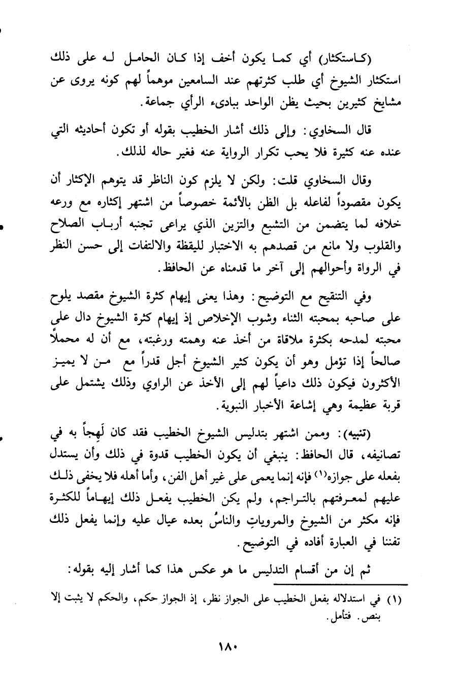 وقال السخاوي قلت: ولكن لا يلزم كون الناظر قد يتوهم الإكثار أن يكون مقصوداً لفاعله بل الظن بالأئمة خصوصاً من اشتهر إكثاره مع ورعه خلافه لما يتضمن من التشبع والتزين الذي يراعى تجنبه أرباب الصلاح والقلوب ولا مانع من قصدهم به الاختبار لليقظة والالتفات إلى حسن النظر في الرواة وأحوالهم إلى آخر ما قدمناه عن الحافظ.