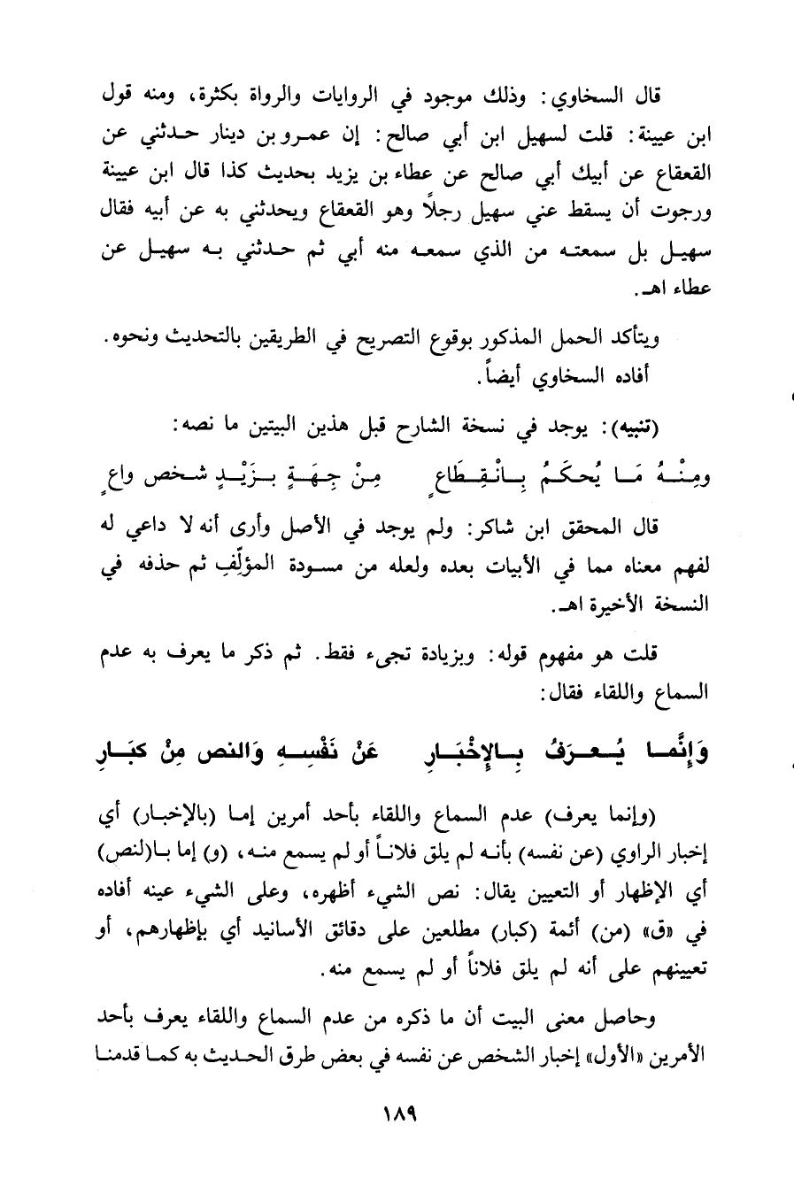 وحاصل معنى البيت أن ما ذكره من عدم السماع واللقاء يعرف بأحد الأمرين " الأول " إخبار الشخص عن نفسه في بعض طرق الحديث به كما قدمنا