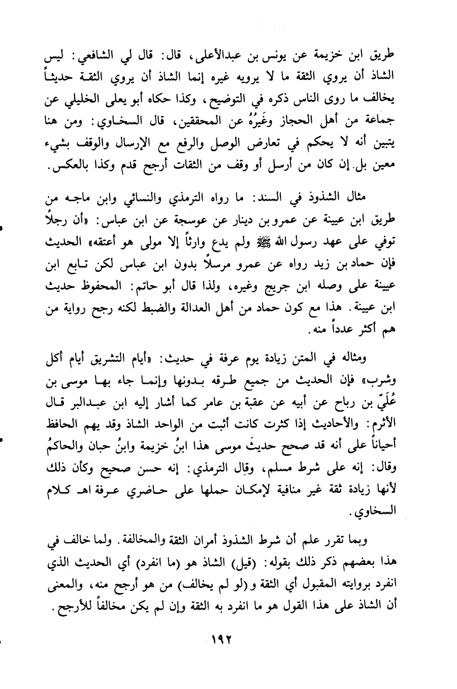 طريق ابن خزيمة عن يونس بن عبد الأعلى، قال: قال لي الشافعي: ليس الشَّاذ أن يروي الثقة ما لا يرويه غيره إنما الشَّاذ أن يروي الثقة حديثاً يخالف ما روى النَّاس ذكره في التوضيح، وكذا حكاه أبو يعلى الخليلي عن جماعة من أهل الحجاز وغَيرُهُ عن المحققين، قال السخاوي: ومن هنا يتبين أنه لا يحكم في تعارض الوصل والرفع مع الإرسال والوقف بشيء معين بل. إن كان من أرسل أو وقف من الثقات أرجح قدم وكذا بالعكس.