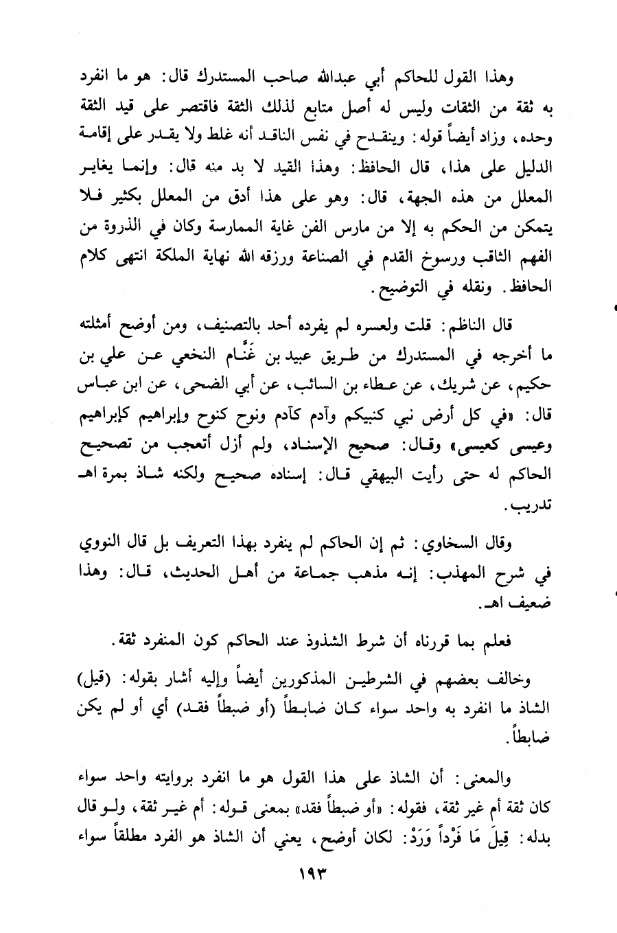 وهذا القول للحاكم أبي عبد الله صاحب المستدرك قال: هو ما انفرد به ثقة من الثقات وليس له أصل متابع لذلك الثقة فاقتصر على قيد الثقة وحده، وزاد أيضاً قوله: وينقدح في نفس الناقد أنه غلط ولا يقدر على إقامة الدليل على هذا، قال الحافظ: وهذا القيد لا بدَّ منه قال: وإنما يغاير المعلل من هذه الجهة، قال: وهو على هذا أدق من المعلل بكثير فلا يتمكن من الحكم به إلا من مارس الفن غاية الممارسة وكان في الذروة من الفهم الثاقب ورسوخ القدم في الصناعة ورزقه الله نهاية الملكة انتهى كلام الحافظ. ونقله في التوضيح.