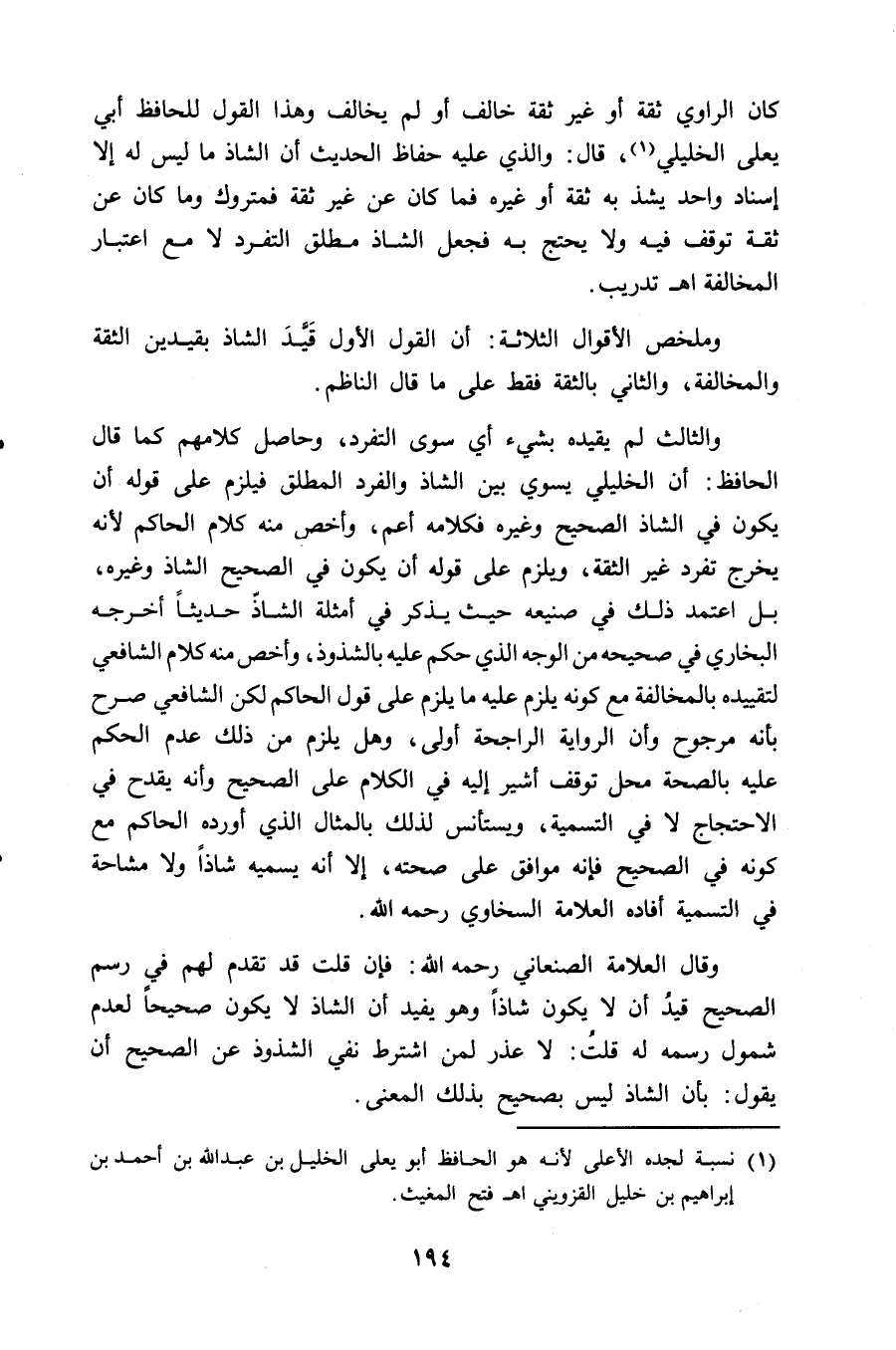 والثالث لم يقيده بشيء أي سوى التفرد، وحاصل كلامهم كما قال الحافظ: أن الخليلي يسوي بين الشَّاذ والفرد المطلق فيلزم على قوله أن يكون في الشَّاذ الصَّحِيح وغيره فكلامه أعم، وأخص منه كلام الحاكم لأنه يخرج تفرد غير الثقة، ويلزم على قوله أن يكون في الصَّحِيح الشَّاذ وغيره، بل اعتمد ذلك في صنيعه حيث يذكر في أمثلة الشَّاذِّ حديثاً أخرجه البخاري في صحيحه من الوجه الذي حكم عليه بالشذوذ، وأخص منه كلام الشافعي لتقييده بالمخالفة مع كونه يلزم عليه ما يلزم على قول الحاكم لكن الشافعي صرح بأنه مرجوح وأن الرواية الراجحة أولى، وهل يلزم من ذلك عدم الحكم عليه بالصحة محل توقف أشير إليه في الكلام على الصَّحِيح وأنه يقدح في الاحتجاج لا في التسمية، ويستأنس لذلك بالمثال الذي أورده الحاكم مع كونه في الصَّحِيح فإنه موافق على صحته، إلا أنه يسميه شاذًّا ولا مشاحة في التسمية أفاده العلامة السخاوي رحمه الله.