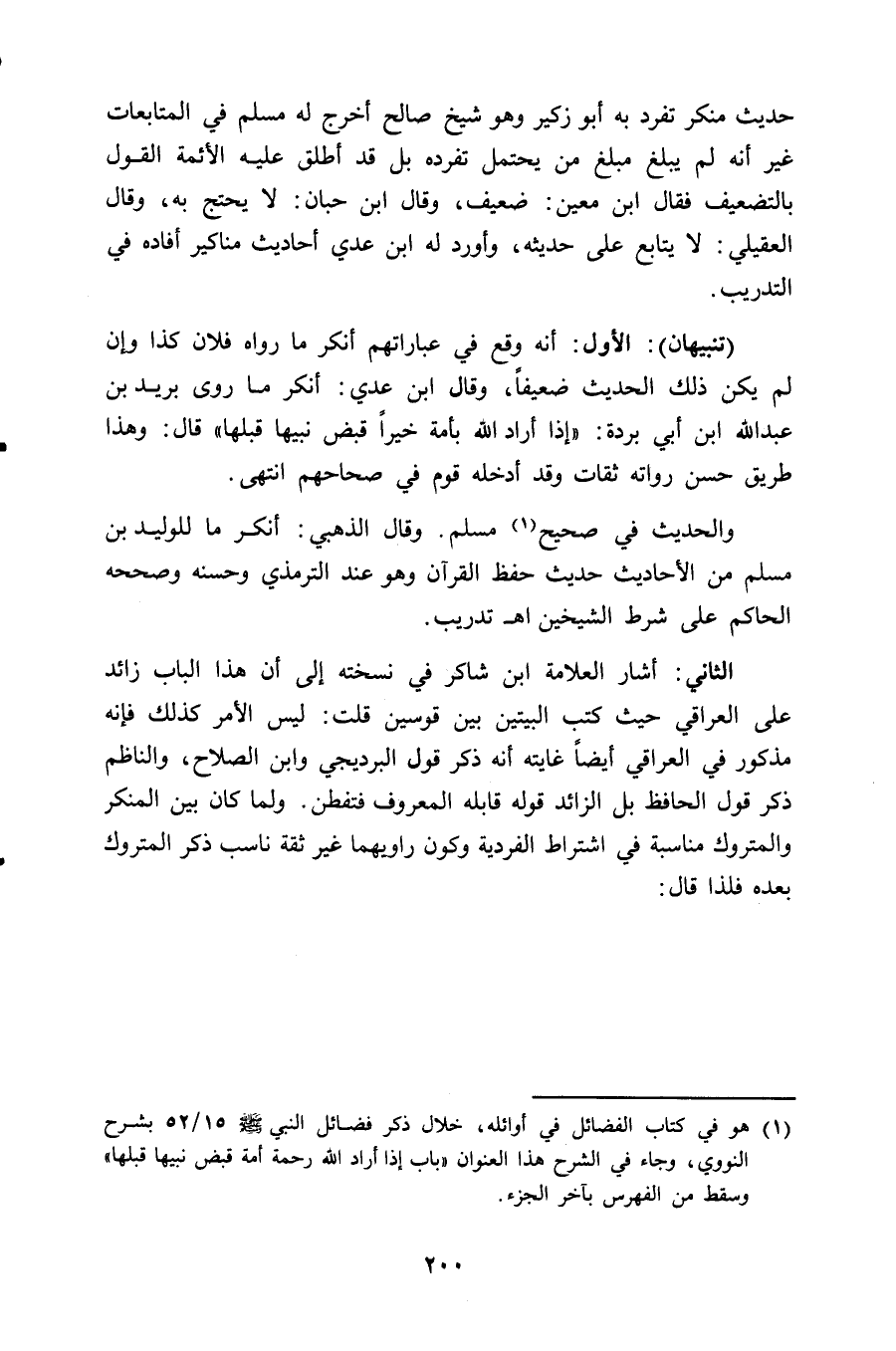 (تنبيهان): الأول: أنه وقع في عباراتهم أنكر ما رواه فلان كذا وإن لم يكن ذلك الحديث ضعيفاً، وقال ابن عدي: أنكر ما روى بريد بن عبد الله ابن أبي بردة: " إذا أراد الله بأمة خيراً قبض نبيها قبلها " قال: وهذا طريق حسن رواته ثقات وقد أدخله قوم في صحاحهم انتهى.