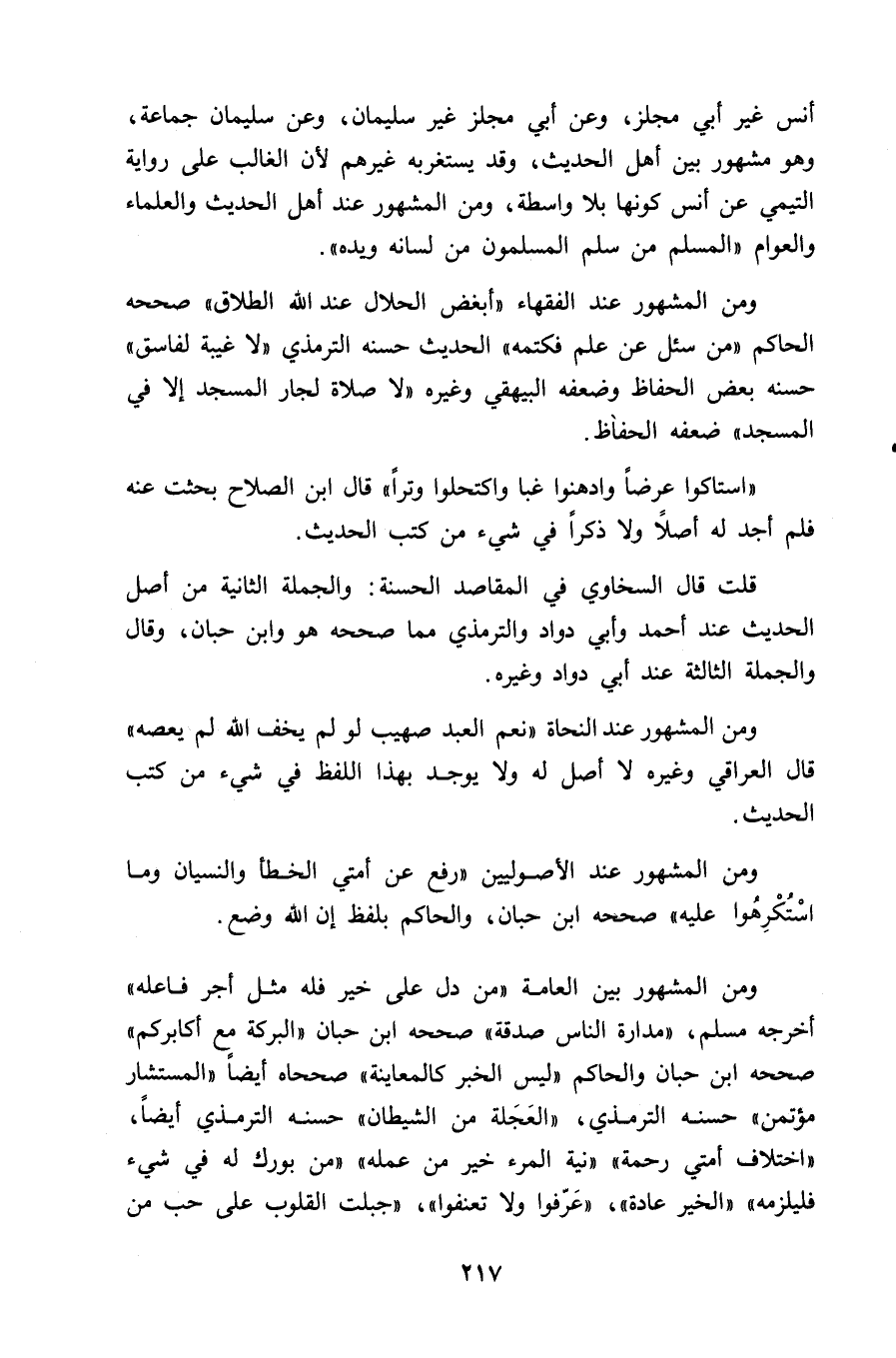 ومن المشهور عند الفقهاء " أبغض الحلال عند الله الطلاق " صححه الحاكم " من سئل عن علم فكتمه " الحديث حسنه الترمذي " لا غيبة لفاسق " حسنه بعض الحفاظ وضعفه البيهقي وغيره " لا صلاة لجار المسجد إلا في المسجد " ضعفه الحفاظ.