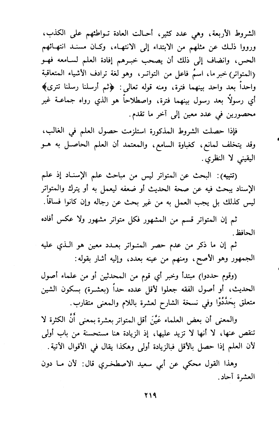 الشروط الأربعة، وهي عدد كثير، أحالت العادة تواطئهم على الكذب، ورووا ذلك عن مثلهم من الابتداء إلى الانتهاء، وكان مسند انتهائهم الحس، وانضاف إلى ذلك أن يصحب خبرهم إفادة العلم لسامعه فهو (المتواتر) خبر ما، اسمُ فاعل من التواتر، وهو لغة ترادف الأشياء المتعاقبة واحداً بعد واحد بينهما فترة، ومنه قوله تعالىِ: (ثُمَّ أَرْسَلْنَا رُسُلَنَا تَتْرَى) أي رسولاً بعد رسول بينهما فترة، واصطلاحاً هو الذي رواه جماعة غير محصورين في عدد معين إلى آخر ما تقدم.