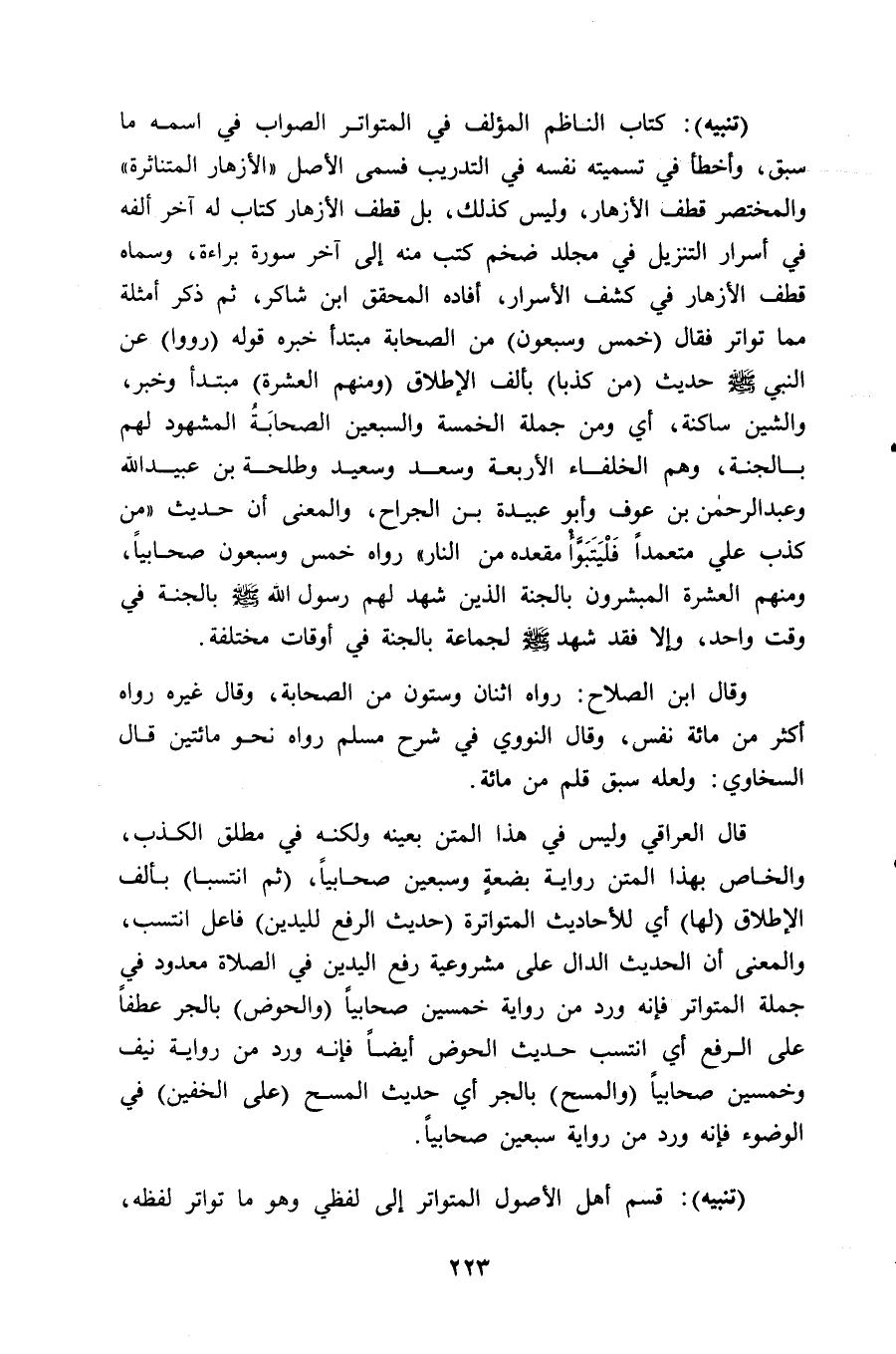 قال العراقي وليس في هذا المتن بعينه ولكنه في مطلق الكذب، والخاص بهذا المتن رواية بضعةٍ وسبعين صحابياً، (ثم انتسبا) بألف الإطلاق (لها) أي للأحاديث المتواترة (حديث الرفع لليدين) فاعل انتسب، والمعنى أن الحديث الدال على مشروعية رفع اليدين في الصلاة معدود في جملة المتواتر فإنه ورد من رواية خمسين صحابياً (والحوض) بالجر عطفاً على الرفع أي انتسب حديث الحوض أيضاً فإنه ورد من رواية نيف وخمسين صحابياً (والمسح) بالجر أي حديث المسح (على الخفين) في الوضوء فإنه ورد من رواية سبعين صحابياً.