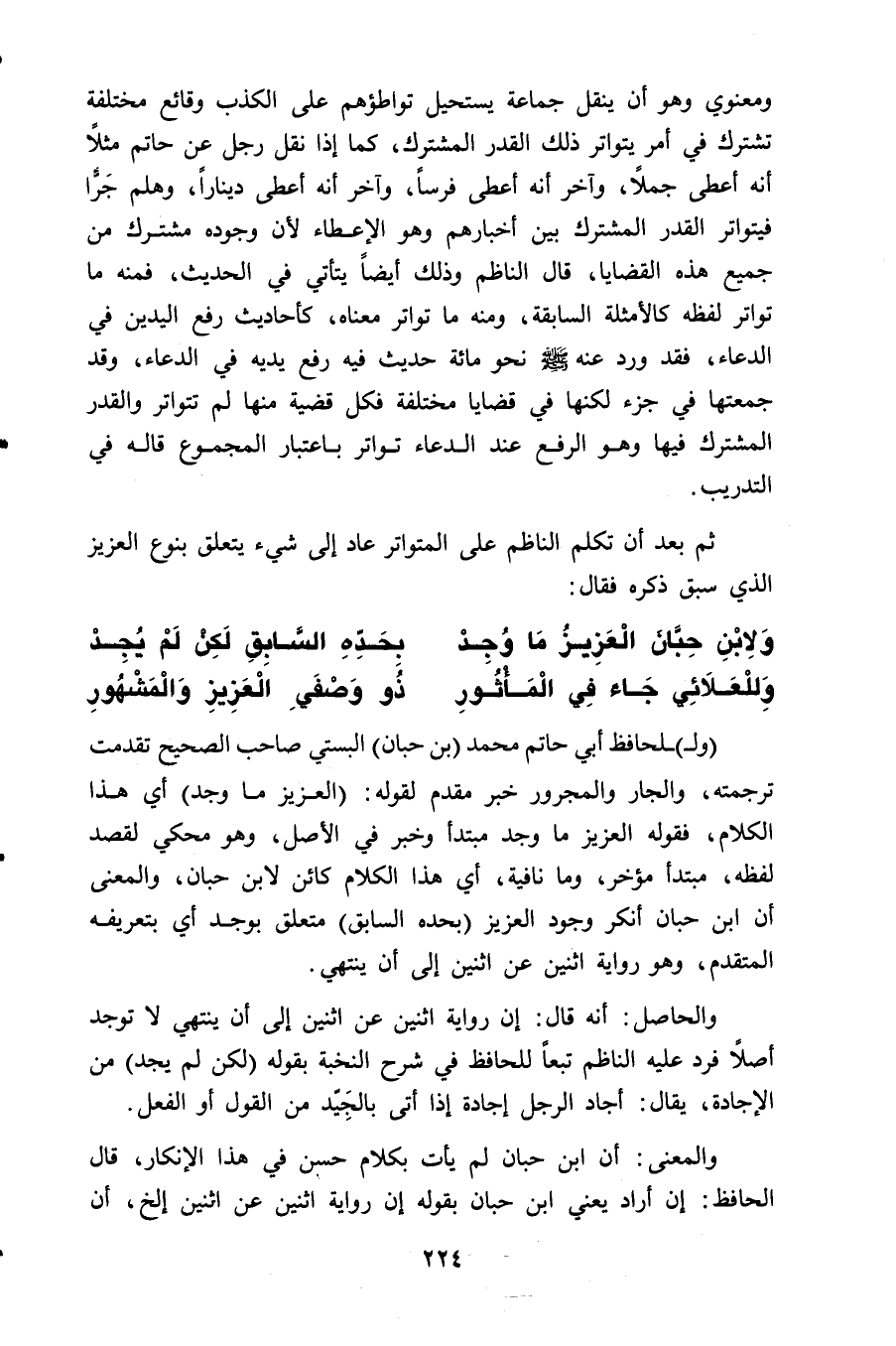 (ولـ) لحافظ أبي حاتم محمد (بن حبان) البستي صاحب الصَّحِيح تقدمت ترجمته، والجار والمجرور خبر مقدم لقوله: (الْعَزِيزُ مَا وُجِدْ) أي هذا الكلام، فقوله العزيز ما وجد مبتدأ وخبر في الأصل، وهو محكي لقصد لفظه، مبتدأ مؤخر، وما نافية، أي هذا الكلام كائن لابن حبان، والمعنى أن ابن حبان أنكر وجود العزيز (بحده السابق) متعلق بوجد أي بتعريفه المتقدم، وهو رواية اثنين عن اثنين إلى أن ينتهي.