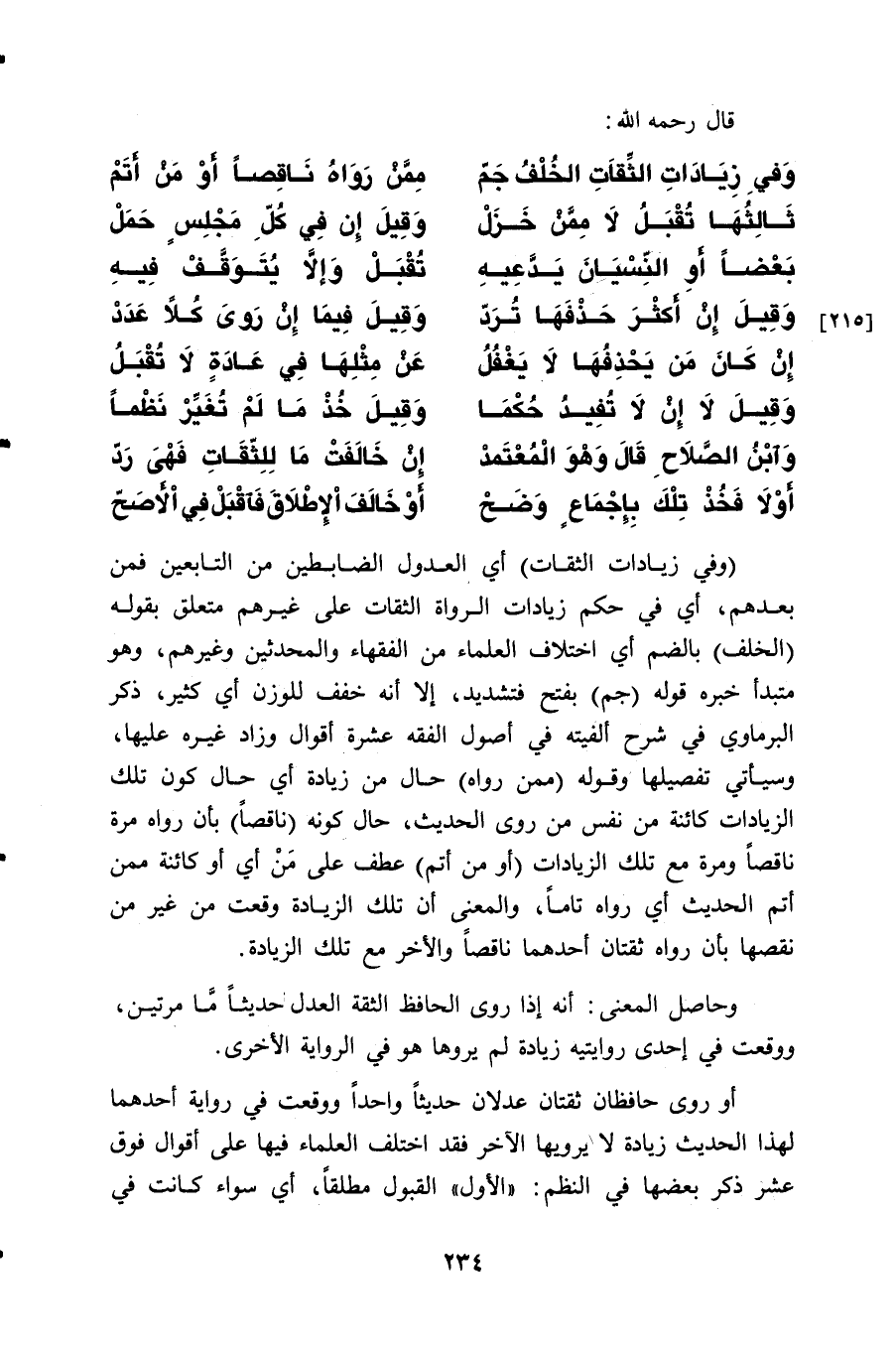 (وفي زيادات الثقات) أي العدول الضابطين من التابعين فمن بعدهم، أي في حكم زيادات الرواة الثقات على غيرهم متعلق بقوله (الخلف) بالضم أي اختلاف العلماء من الفقهاء والمحدثين وغيرهم، وهو مبتدأ خبره قوله (جم) بفتح فتشديد، إلا أنه خفف للوزن أي كثير، ذكر البرماوي في شرح ألفيته في أصول الفقه عشرة أقوال وزاد غيره عليها، وسيأتي تفصيلها وقوله (ممن رواه) حال من زيادة أي حال كون تلك الزيادات كائنة من نفس من روى الحديث، حال كونه (ناقصاً) بأن رواه مرة ناقصاً ومرة مع تلك الزيادات (أو من أتم) عطف على مَنْ أي أو كائنة ممن أتم الحديث أي رواه تاماً، والمعنى أن تلك الزيادة وقعت من غير من نقصها بأن رواه ثقتان أحدهما ناقصاً والآخر مع تلك الزيادة.