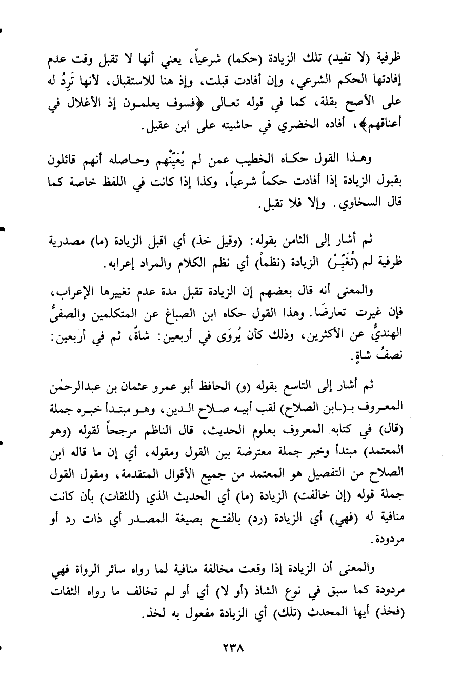 ثم أشار إلى التاسع بقوله (و) الحافظ أبو عمرو عثمان بن عبد الرحمن المعروف بـ (ابن الصلاح) لقب أبيه صلاح الدين، وهو مبتدأ خبره جملة (قال) في كتابه المعروف بعلوم الحديث، قال الناظم مرجحاً لقوله (وهو المعتمد) مبتدأ وخبر جملة معترضة بين القول ومقوله، أي إن ما قاله ابن الصلاح من التفصيل هو المعتمد من جميع الأقوال المتقدمة، ومقول القول جملة قوله (إن خالفت) الزيادة (ما) أي الحديث الذي (للثقات) بأن كانت منافية له (فهي) أي الزيادة (رد) بالفتح بصيغة المصدر أي ذات رد أو مردودة.