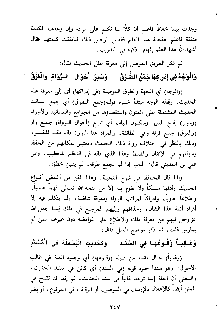 (والوجه) أي الجهة والطرق الموصلة (في إدراكها) أي إلى معرفة علة الحديث، وقوله الوجه مبتدأ خبره قوله (جمع الطرق) أي جمع أسانيد الحديث المشتملة على المتون واستقصاؤها من الجوامع والمسانيد والأجزاء (وَسَبْرُ) بفتح السين وسكون الباء، أي تتبع (أحوال الرواة) جمع راو (والفرق) جمع فرقة وهي الطائفة، والمراد هنا الرواة فالعطف للتفسير، وذلك بالنظر في اختلاف رواة ذلك الحديث ويعتبر بمكانهم من الحفظ ومنزلتهم في الإتقان والضبط وهذا الذي قاله في النظم للخطيب، وعن علي بن المديني قال: الباب إذا لم تجمع طرقه، لم يتبين خطؤه.