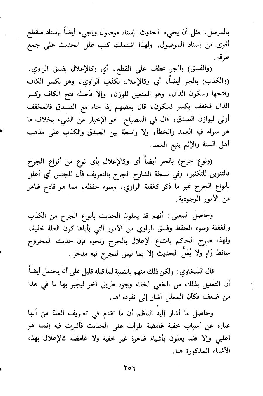 وحاصل المعنى: أنهم قد يعلون الحديث بأنواع الجرح من الكذب والغفلة وسوء الحفظ وفسق الراوي من الأمور التي يأباها كون العلة خفية، ولهذا صرح الحاكم بامتناع الإعلال بالجرح ونحوه فإن حديث المجروح ساقط وَاهٍ ولا يُعَلُّ الحديث إلا بما ليس للجرح فيه مدخل.