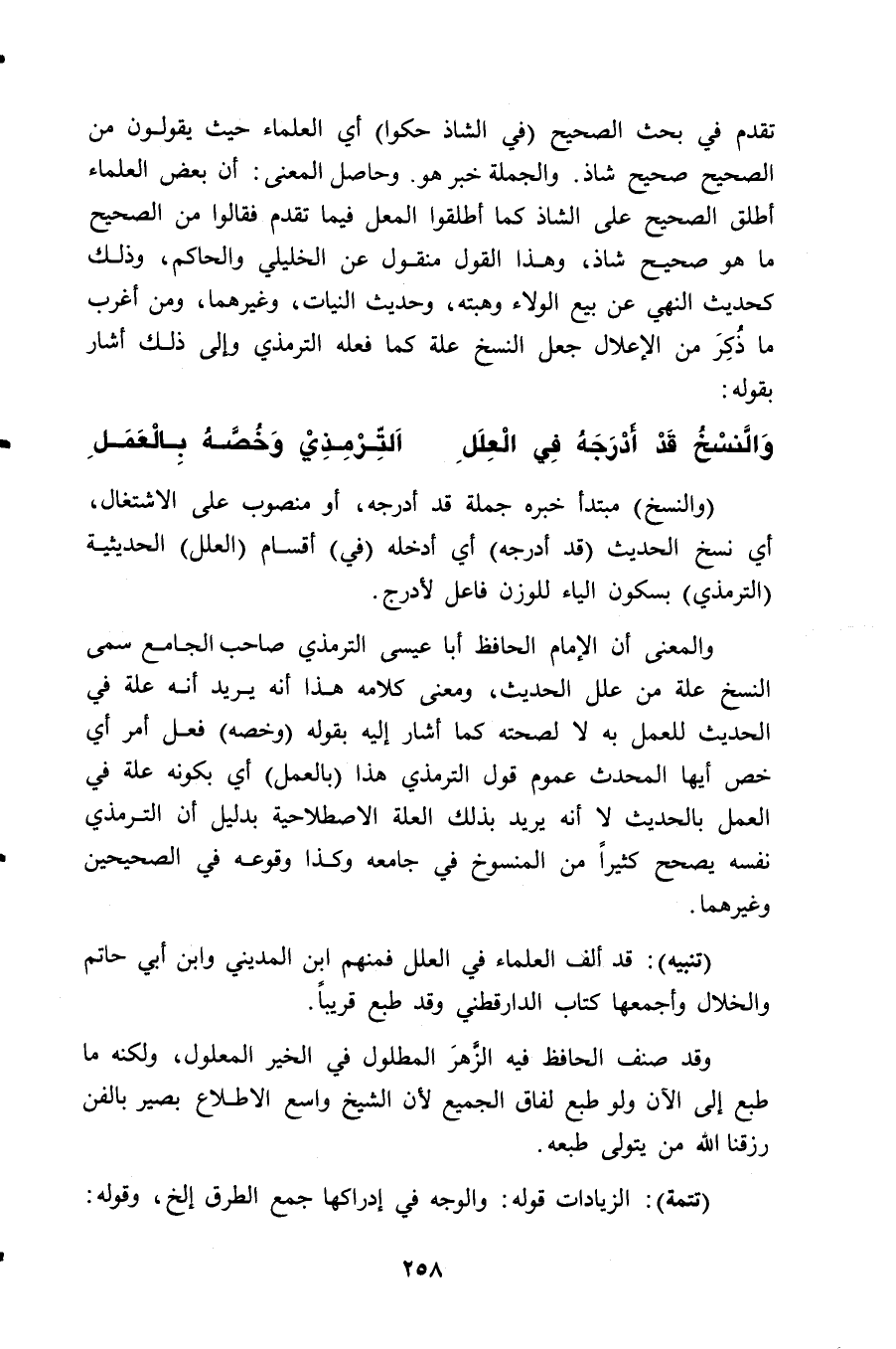 والمعنى أن الإمام الحافظ أبا عيسى الترمذي صاحب الجامع سمى النسخ علة من علل الحديث، ومعنى كلامه هذا أنه يريد أنه علة في الحديث للعمل به لا لصحته كما أشار إليه بقوله (وخصه) فعل أمر أي خص أيها المحدث عموم قول الترمذي هذا (بالعمل) أي بكونه علة في العمل بالحديث لا أنه يريد بذلك العلة الاصطلاحية بدليل أن الترمذي نفسه يصحح كثيراً من المنسوخ في جامعه وكذا وقوعه في الصَّحِيحين وغيرهما.