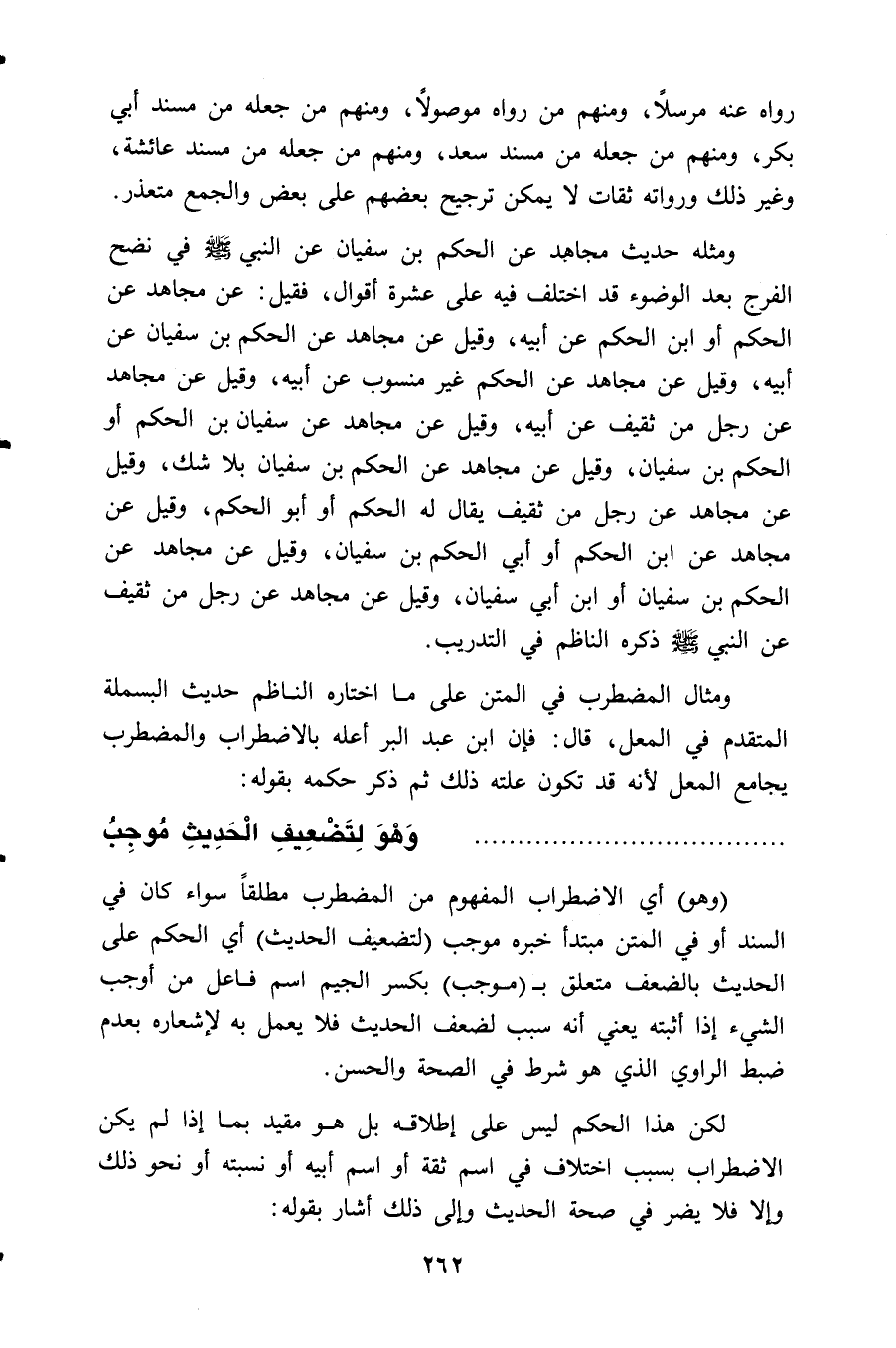ومثله حديث مجاهد عن الحكم بن سفيان عن النبي - صلى الله عليه وسلم - في نضح الفرج بعد الوضوء قد اختلف فيه على عشرة أقوال، فقيل: عن مجاهد عن الحكم أو ابن الحكم عن أبيه، وقيل عن مجاهد عن الحكم بن سفيان عن أبيه، وقيل عن مجاهد عن الحكم غير منسوب عن أبيه، وقيل عن مجاهد عن رجل من ثقيف عن أبيه، وقيل عن مجاهد عن سفيان بن الحكم أو الحكم بن سفيان، وقيل عن مجاهد عن الحكم بن سفيان بلا شك، وقيل عن مجاهد عن رجل من ثقيف يقال له الحكم أو أبو الحكم، وقيل عن مجاهد عن ابن الحكم أو أبي الحكم بن سفيان، وقيل عن مجاهد عن الحكم بن سفيان أو ابن أبي سفيان، وقيل عن مجاهد عن رجل من ثقيف عن النبي - صلى الله عليه وسلم - ذكره الناظم في التدريب.