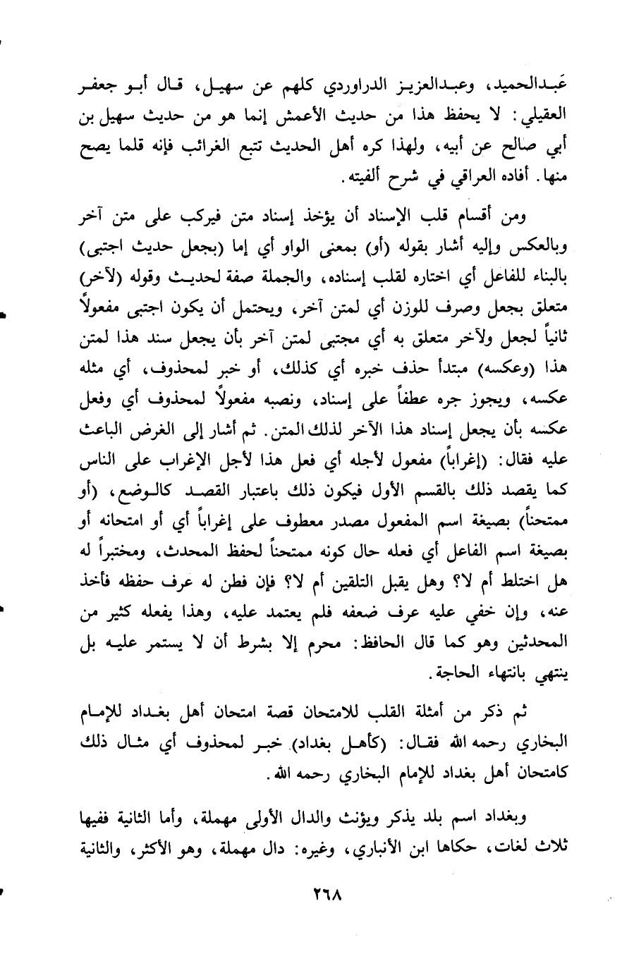 ثم ذكر من أمثلة القلب للامتحان قصة امتحان أهل بغداد للإمام البخاري رحمه الله فقال: (كأهل بغداد) خبر لمحذوف أي مثال ذلك كامتحان أهل بغداد للإمام البخاري رحمه الله.