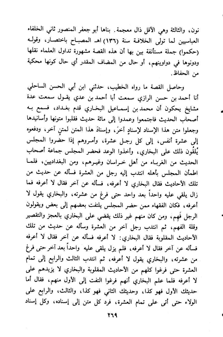 وحاصل القصة ما رواه الخطيب، حدثني ابن أبي الحسن الساحلي أنا أحمد بن حسن الرازي سمعت أبا أحمد بن عدي يقول سمعت عدة مشايخ يحكون أن محمد بن إسماعيل البخاري قدم بغداد، فسمع به أصحاب الحديث فاجتمعوا وعمدوا إلى مائة حديث فقلبوا متونها وأسانيدها وجعلوا متن هذا الإسناد لإسنادٍ آخرَ، وإسنادَ هذا المتن لمتنٍ آخر، ودفعوه إلى عشرة أنفس، إلى كل رجل عشرة، وأمروهم إذا حضروا المجلس يُلقُون ذلك على البخاري، وأخذوا الوعد فحضر المجلس جماعة أصحاب الحديث من الغرباء من أهل خراسان وغيرهم، ومن البغداديين، فلما اطمأن المجلس بأهله انتدب إليه رجل من العشرة فسأله عن حديث من تلك الأحاديث فقال البخاري لا أعرفه، فسأله عن آخر فقال لا أعرفه فما زال يلقي عليه واحداً بعد واحد حتى فرغ من عشرته، والبخاري يقول لا أعرفه، فكان الفقهاء ممن حضر المجلس يلتفت بعضهم إلى بعض ويقولون الرجل فَهِم، ومن كان منهم غير ذلك يقضي على البخاري بالعجز والتقصير وقلة الفهم، ثم انتدب رجل آخر من العشرة وسأله عن حديث من تلك الأحاديث المقلوبة فقال البخاري: لا أعرفه فسأله عن آخر فقال لا أعرفه فسأله عن آخر فقال لا أعرفه، فلم يزل يلقى عليه واحداً بعد آخر حتى فرغ من عشرته، والبخاري يقول لا أعرفه، ثم انتدب الثالث والرابع إلى تمام العشرة حتى فرغوا كلهم من الأحاديث المقلوبة والبخاري لا يزيدهم على لا أعرفه فلما علم البخاري أنهم فرغوا التفت إلى الأول منهم، فقال أما حديثك الأول فهو كذا، وحديثك الثاني فهو كذا، والثالث، والرابع على الولاء حتى أتى على تمام العشرة، فرد كل متن إلى إسناده، وكل إسناد